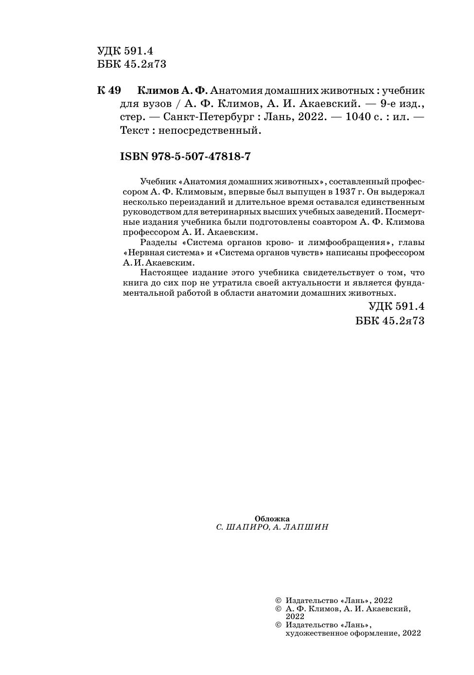 Учебник "Анатомия домашних животных", составленный профессором А. Ф. Климовым, впервые был выпущен в 1937 г. Он выдержал несколько переизданий и длительное время оставался единственным руководством для ветеринарных высших учебных заведений. Посмертные издания учебника были подготовлены соавтором А. Ф. Климова профессором А. И. Акаевским. Разделы "Система органов крово- и лимфообращения", главы "Нервная система" и "Система органов чувств" написаны профессором А. И. Акаевским. Настоящее репринтное издание этого учебника свидетельствует о том, что книга до сих пор не утратила своей актуальности и является фундаментальной работой в области анатомии домашних животных.