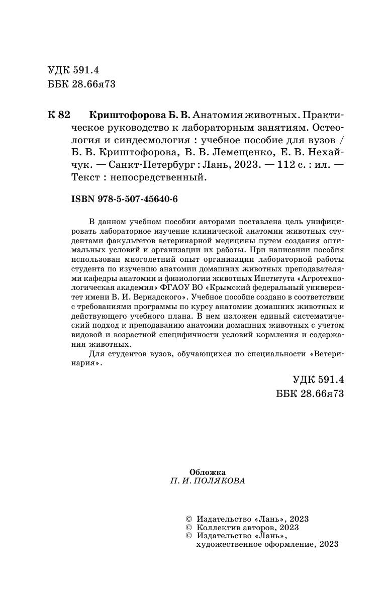 В данном учебном пособии авторами поставлена цель унифицировать лабораторное изучение клинической анатомии животных студентами факультетов ветеринарной медицины путем создания оптимальных условий и организации их работы. При написании пособия использован многолетний опыт организации лабораторной работы студента по изучению анатомии домашних животных преподавателями кафедры анатомии и физиологии животных Института «Агротехнологическая академия» ФГАОУ ВО «Крымский федеральный университет имени В. И. Вернадского». Учебное пособие создано в соответствии с требованиями программы по курсу анатомии домашних животных и действующего учебного плана. В нем изложен единый систематический подход к преподаванию анатомии домашних животных с учетом видовой и возрастной специфичности условий кормления и содержания животных. Для студентов вузов, обучающихся по специальности «Ветеринария».