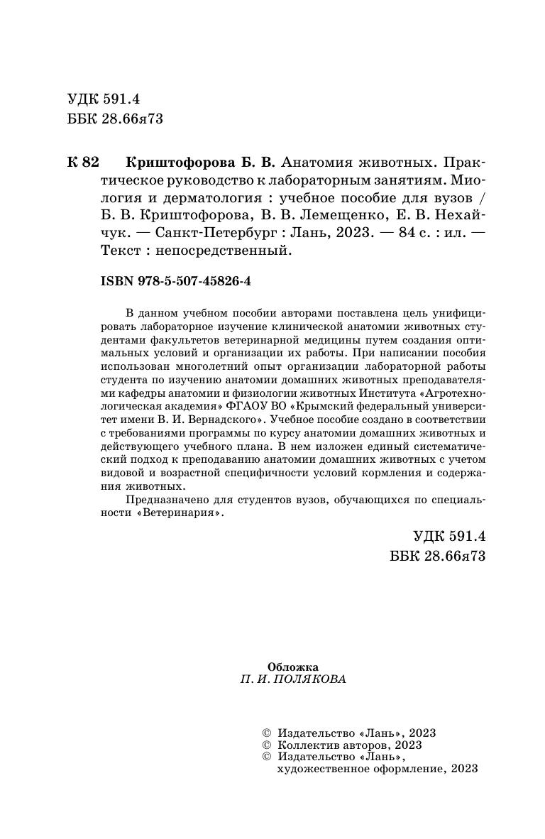 В данном учебном пособии авторами поставлена цель унифицировать лабораторное изучение клинической анатомии животных студентами факультетов ветеринарной медицины путем создания оптимальных условий и организации их работы. При написании пособия использован многолетний опыт организации лабораторной работы студента по изучению анатомии домашних животных преподавателями кафедры анатомии и физиологии животных Института «Агротехнологическая академия» ФГАОУ ВО «Крымский федеральный университет имени В. И. Вернадского». Учебное пособие создано в соответствии с требованиями программы по курсу анатомии домашних животных и действующего учебного плана. В нем изложен единый систематический подход к преподаванию анатомии домашних животных с учетом видовой и возрастной специфичности условий кормления и содержания животных. Предназначено для студентов вузов, обучающихся по специальности «Ветеринария».