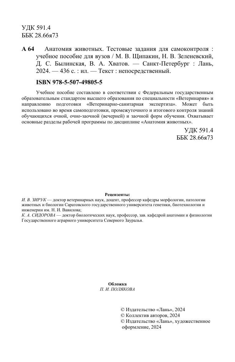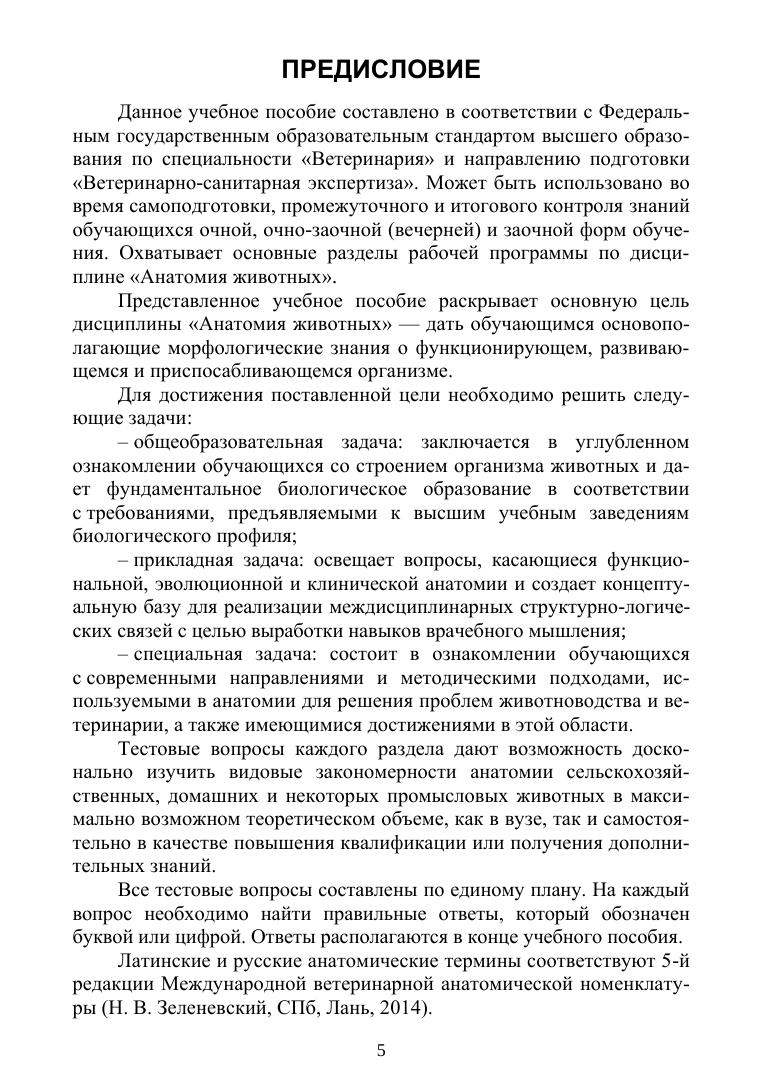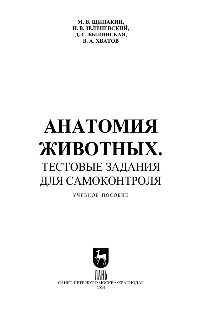 Учебное пособие составлено в соответствии с Федеральным государственным образовательным стандартом высшего образования по специальности «Ветеринария» и направлению подготовки «Ветеринарно-санитарная экспертиза». Может быть использовано во время самоподготовки, промежуточного и итогового контроля знаний обучающихся очной, очно-заочной (вечерней) и заочной форм обучения. Охватывает основные разделы рабочей программы по дисциплине «Анатомия животных».