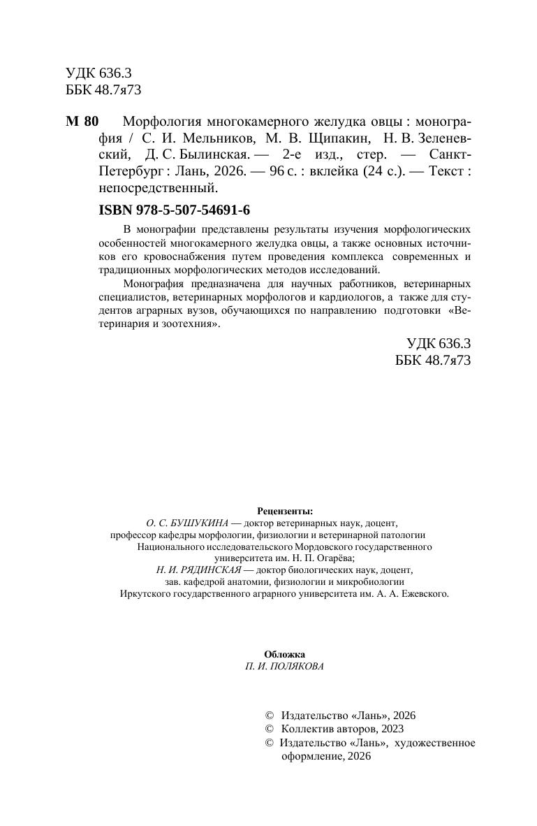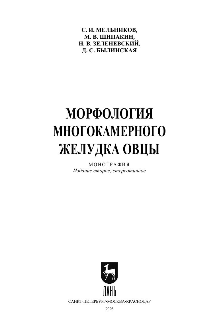 В монографии представлены результаты изучения морфологических особенностей многокамерного желудка овцы, а также основных источников его кровоснабжения путем проведения комплекса современных и традиционных морфологических методов исследо-ваний. Монография предназначена для научных работников, ветеринарных специалистов, ветеринарных морфологов и кардиологов, а также для студентов аграрных вузов, обучающихся по направлению подготовки «Ветеринария и зоотехния».