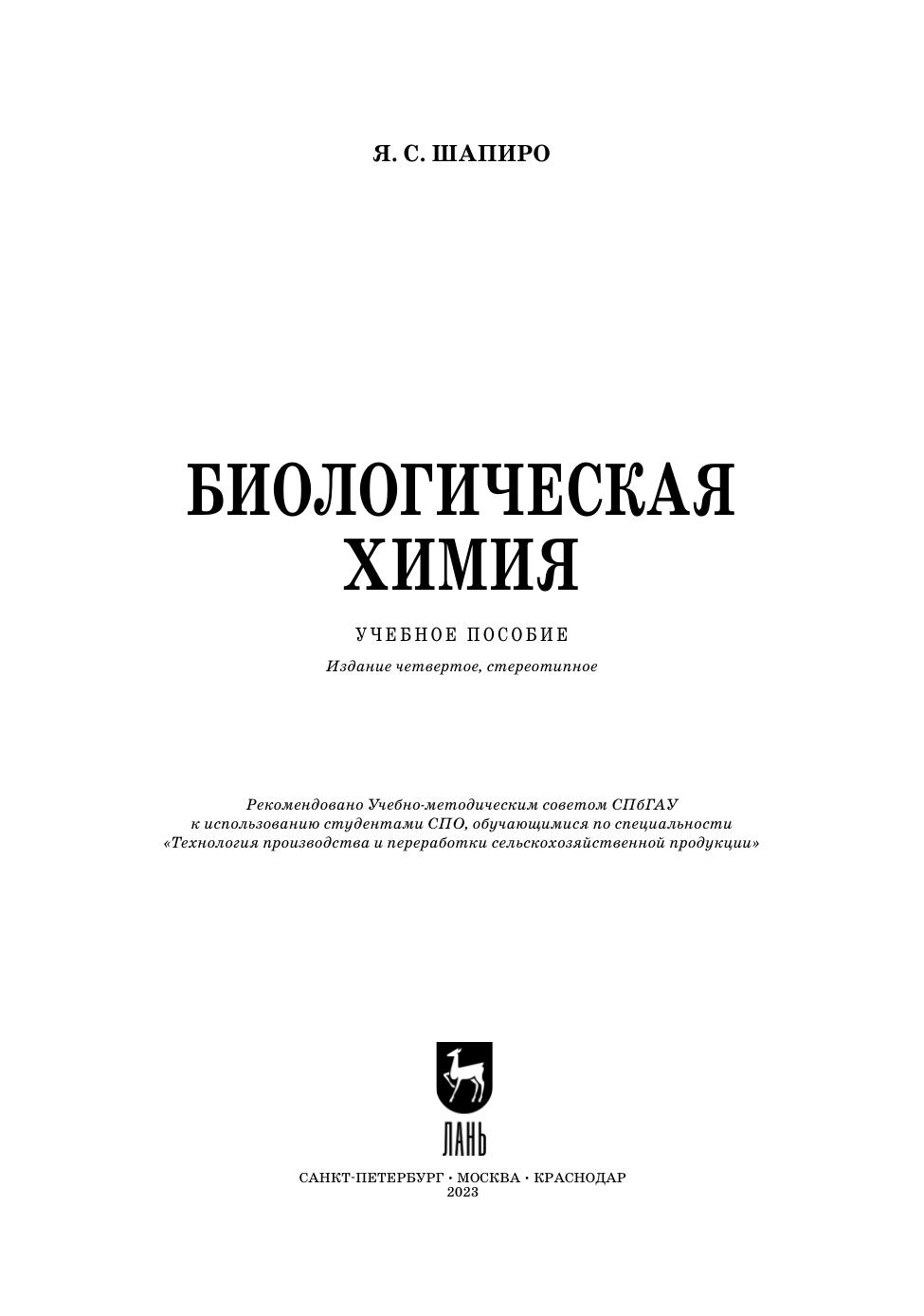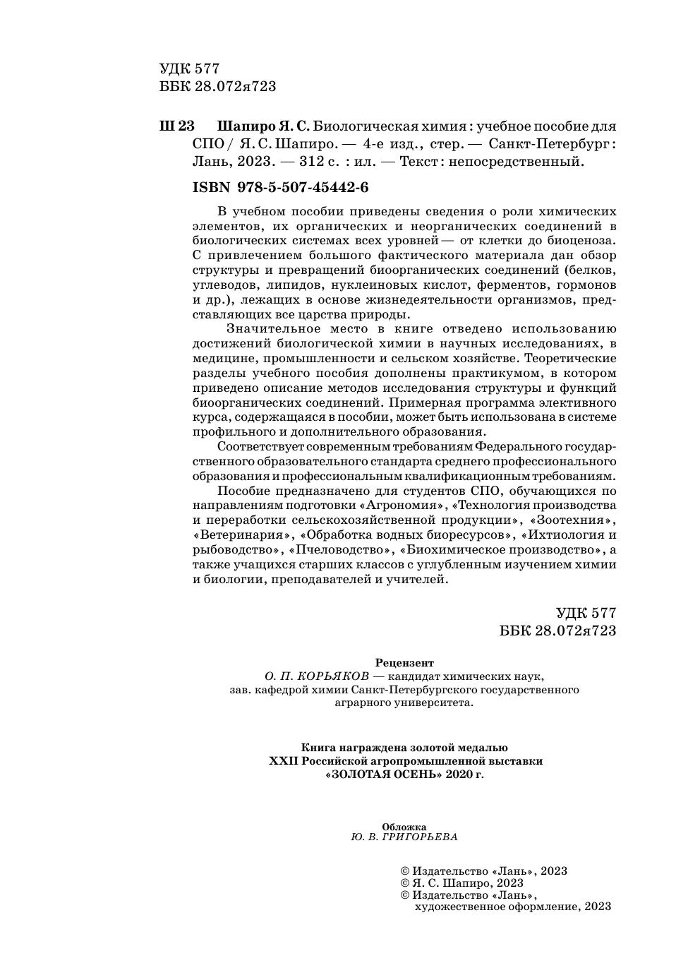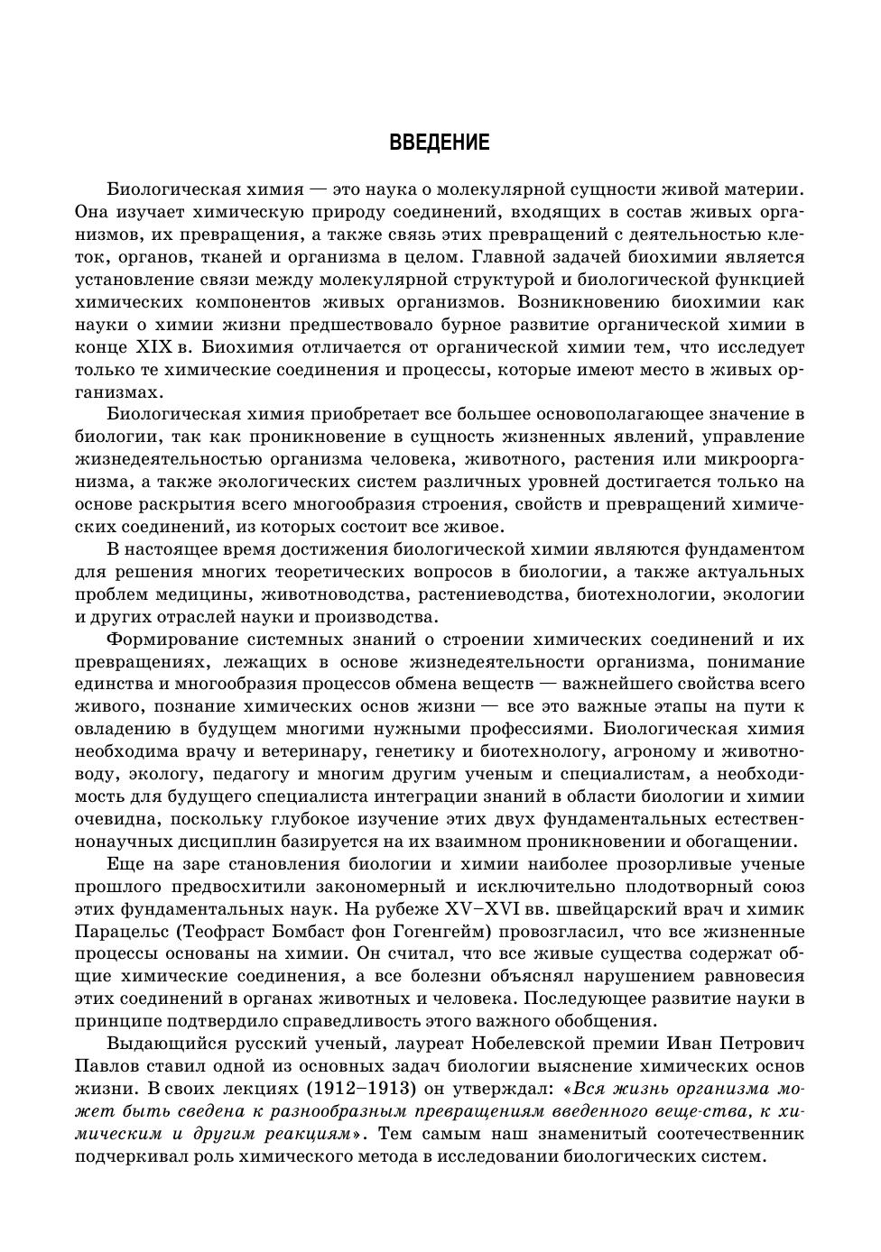 В учебном пособии приведены сведения о роли химических элементов, их органических и неорганических соединений в биологических системах всех уровней — от клетки до биоценоза. С привлечением большого фактического материала дан обзор структуры и превращений биоорганических соединений (белков, углеводов, липидов, нуклеиновых кислот, ферментов, гормонов и др.), лежащих в основе жизнедеятельности организмов, представляющих все царства природы. Значительное место в книге отведено использованию достижений биологической химии в научных исследованиях, в медицине, промышленности и сельском хозяйстве. Теоретические разделы учебного пособия дополнены практикумом, в котором приведено описание методов исследования структуры и функций биоорганических соединений. Примерная программа элективного курса, содержащаяся в пособии, может быть использована в системе профильного и дополнительного образования. Соответствует современным требованиям Федерального государственного образовательного стандарта среднего профессионального образования и профессиональным квалификационным требованиям. Пособие предназначено для студентов СПО, обучающихся по направлениям подготовки «Агрономия», «Технология производства и переработки сельскохозяйственной продукции», «Зоотехния», «Ветеринария», «Обработка водных биоресурсов», «Ихтиология и рыбоводство», «Пчеловодство», «Биохимическое производство», а также учащихся старших классов с углубленным изучением химии и биологии, преподавателей и учителей. Книга награждена золотой медалью XXII Российской агропромышленной выставки «ЗОЛОТАЯ ОСЕНЬ» 2020 г.