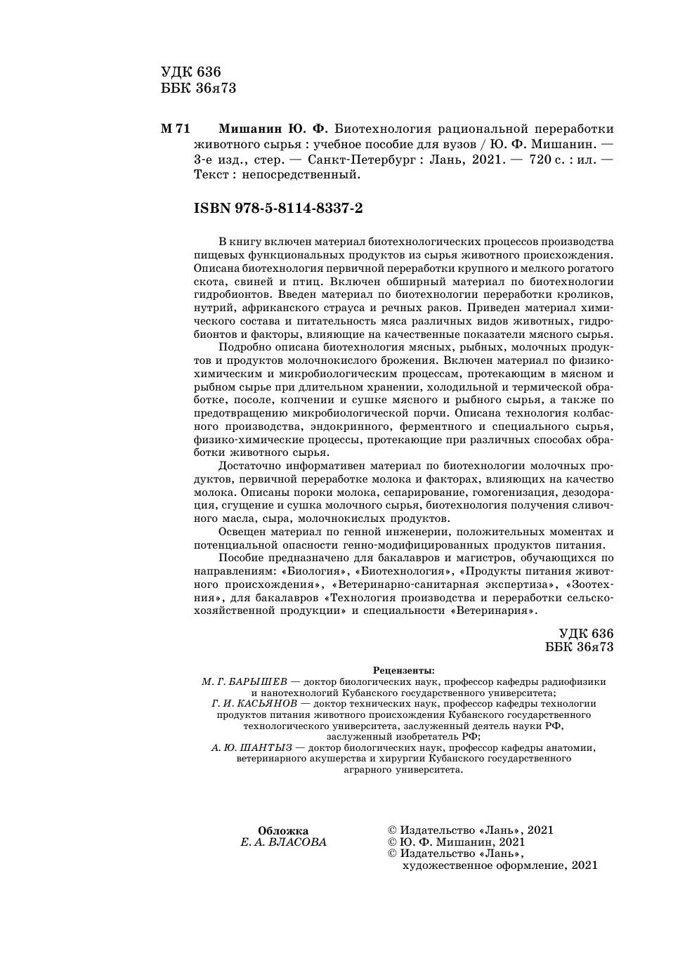Подробно описана биотехнология мясных, рыбных, молочных продуктов и продуктов молочнокислого брожения. Включен материал по физико-химическим и микробиологическим процессам, протекающим в мясном и рыбном сырье при длительном хранении, холодильной и термической обработке, посоле, копчении и сушке мясного и рыбного сырья, а также по предотвращению микробиологической порчи. Описана технология колбасного производства, эндокринного, ферментного и специального сырья, физико-химические процессы, протекающие при различных способах обработки животного сырья.