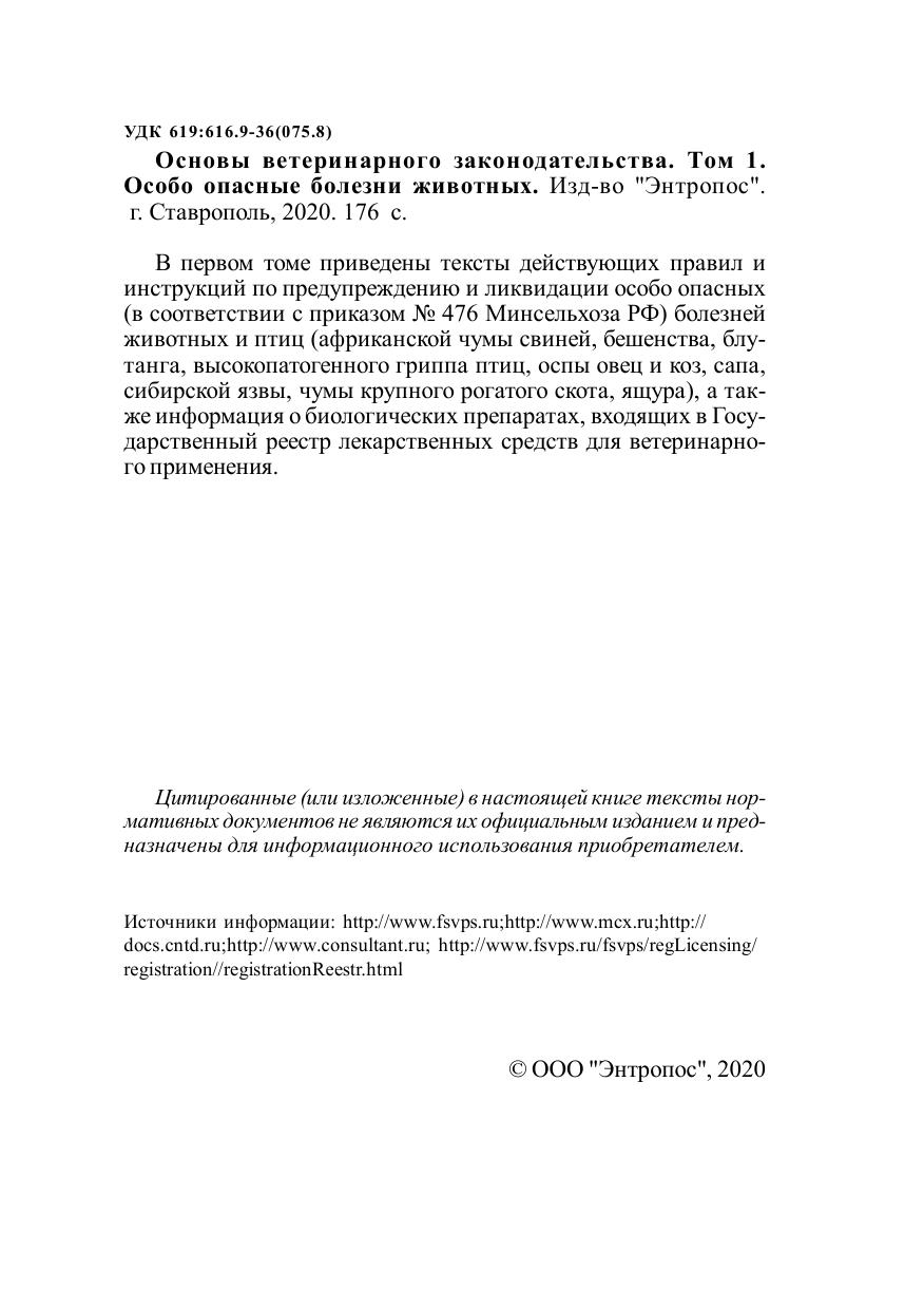 В первом томе приведены тексты действующих правил и инструкций по предупреждению и ликвидации особо опасных (в соответствии с приказом № 476 Минсельхоза РФ) болезней животных и птиц (африканской чумы свиней, бешенства, блутанга, высокопатогенного гриппа птиц, оспы овец и коз, сапа, сибирской язвы, чумы крупного рогатого скота, ящура), а также информация о биологических препаратах, входящих в Государственный реестр лекарственных средств для ветеринарного применения.