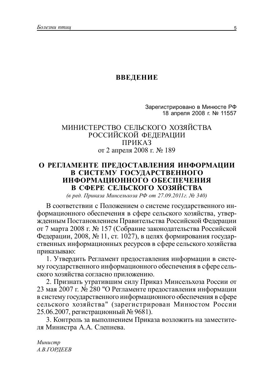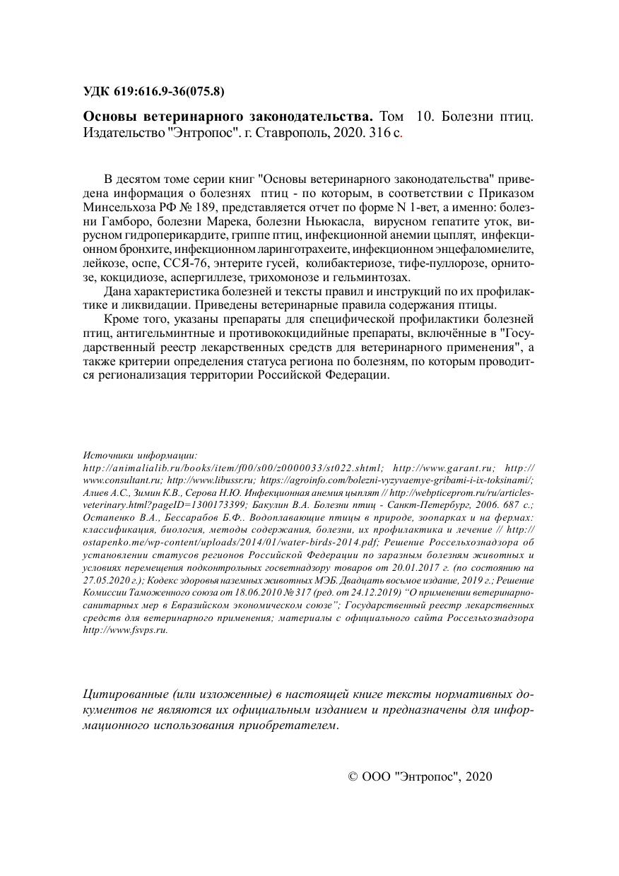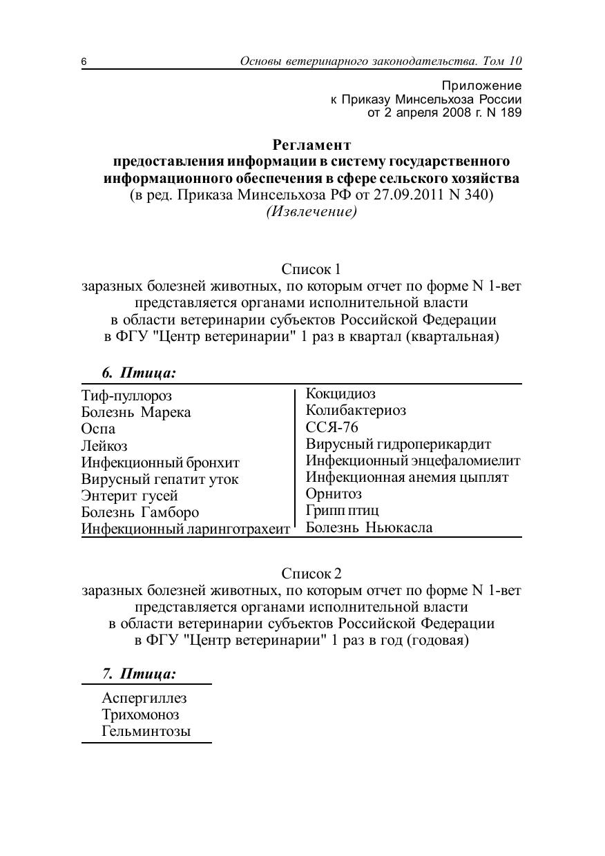 В десятом томе серии книг "Основы ветеринарного законодательства" приведена информация о болезнях птиц, по которым, в соответствии с Приказом Минсельхоза РФ № 189, представляется отчет по форме N 1-вет, а именно: болезни Гамборо, болезни Марека, болезни Ньюкасла, вирусном гепатите уток, вирусном гидроперикардите, гриппе птиц, инфекционной анемии цыплят, инфекционном бронхите, инфекционном ларинготрахеите, инфекционном энцефаломиелите, лейкозе, оспе, ССЯ-76, энтерите гусей, колибактериозе, тифе-пуллорозе, орнитозе, кокцидиозе, аспергиллезе, трихомонозе и гельминтозах.