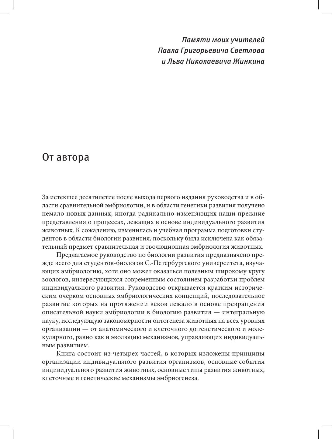 В книге изложены принципы организации индивидуального развития животных. Книга открывается очерком концепций, последовательное развитие которых на протяжении веков лежало в основе превращения описательной эмбриологии в биологию развития — интегральную науку, исследующую закономерности онтогенеза животных на всех уровнях организации — от анатомического и клеточного до генетического и молекулярного, равно как и эволюцию механизмов, управляющих индивидуальным развитием. Центральное положение занимают главы, посвященные развитию основных групп животных — от губок до млекопитающих. Материал по сравнительной эмбриологии животных излагается в соответствии с новой филогенией. Описание включает не только традиционные морфологические характеристики, но и данные о молекулярно-генетических механизмах дифференциации. Заключительные главы касаются проблем экспериментальной эмбриологии, роли материнских факторов, эмбриональной индукции, становления лево-правой асимметрии, генетики развития конечности и других морфогенезов. В главе, посвященной регенерации, анализируется зависимость этого процесса от организации системы поддержания тканевого гомеостаза. В особой главе рассмотрены механизмы детерминации пола, в том числе у червей, насекомых, низших и высших позвоночных. В заключительной главе развивается идея о креативной роли индивидуального развития в возникновении новых форм животных и излагаются аргументы в пользу модели эволюции Metazoa, обусловленной эволюцией генетических систем управления индивидуальным развитием. Предназначено студентам, изучающим эмбриологию животных, а также широкому кругу зоологов, интересующихся современным состоянием проблем индивидуального развития.