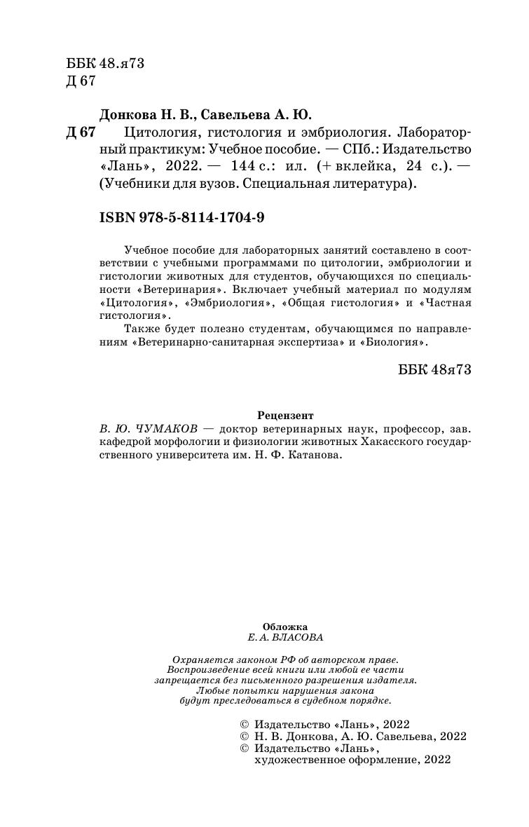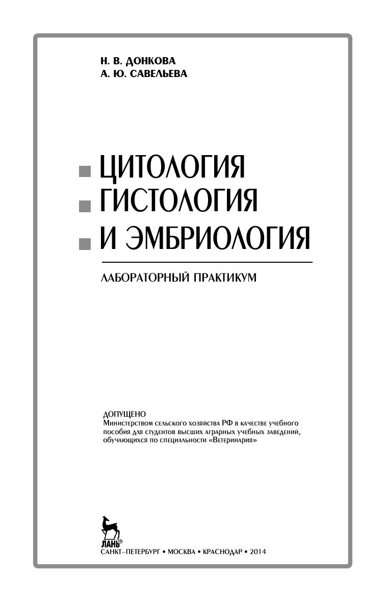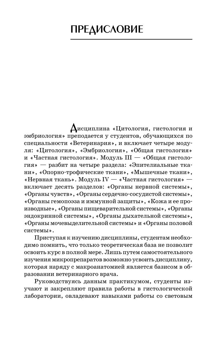 Учебное пособие для лабораторных занятий составлено в соот-ветствии с учебными программами по цитологии, эмбриологии и гистологии животных для студентов, обучающихся по специаль-ности «Ветеринария». Включает учебный материал по модулям «Цитология», «Эмбриология», «Общая гистология» и «Частная гистология». Также будет полезно студентам, обучающимися по направле-ниям «Ветеринарно-санитарная экспертиза» и «Биология».
