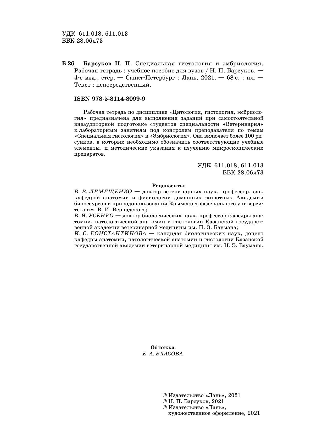 Рабочая тетрадь по дисциплине «Цитология, гистология, эмбриология» предназначена для выполнения заданий при самостоятельной внеаудиторной подготовке студентов специальности «Ветеринария» к лабораторным занятиям под контролем преподавателя по темам: специальная гистология и эмбриология. Она включает более 100 рисунков, в которых необходимо обозначить соответствующие учебные элементы, и методические указания к изучению микроскопических препаратов.