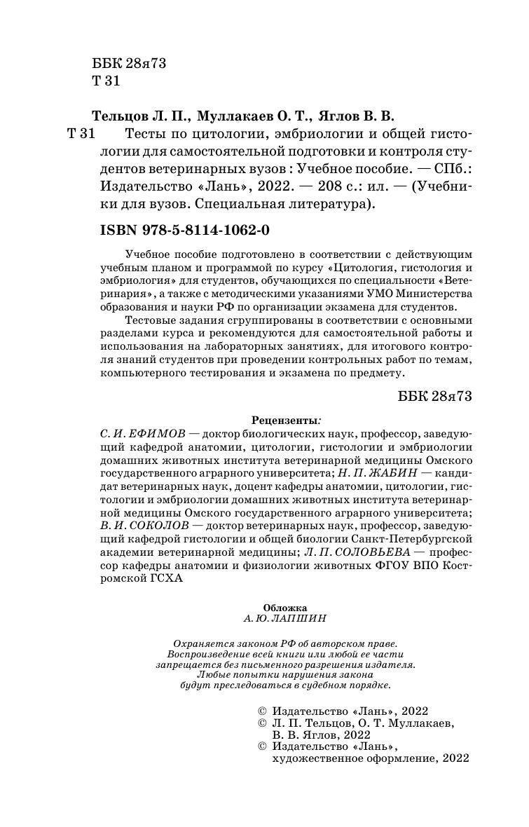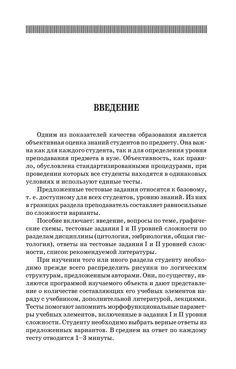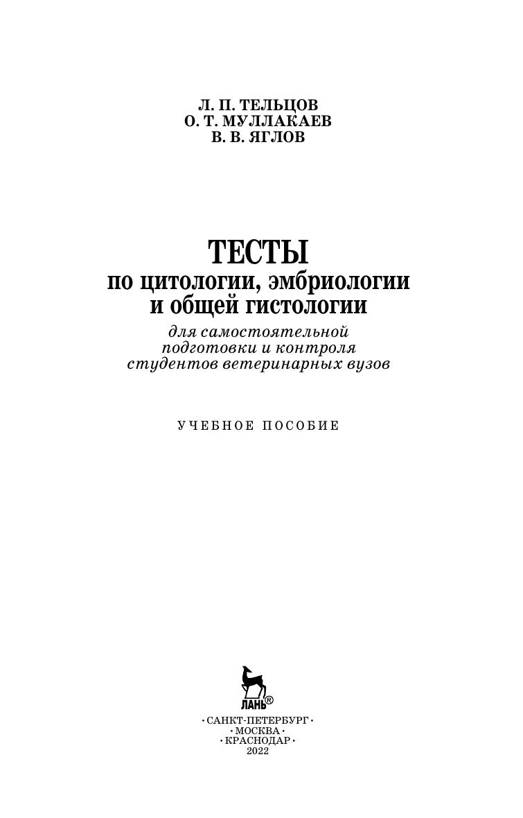 Учебное пособие подготовлено в соответствии с действующим учебным планом и программой по курсу «Цитология, гистология и эмбриология» для студентов, обучающихся по специальности «Ветеринария», а также c методическими указаниями УМО Министерства образования и науки РФ по организации экзамена для студентов. Тестовые задания сгруппированы в соответствии с основными разделами курса и рекомендуются для самостоятельной работы и использования на лабораторных занятиях, для итогового контроля знаний студентов при проведении контрольных работ по темам, компьютерного тестирования и экзамена по предмету.