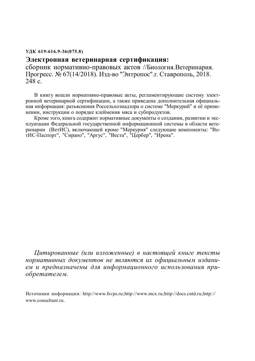 Кроме того, книга содержит нормативные документы о создании, развитии и эксплуатации Федеральной государственной информационной системы в области ветеринарии (ВетИС), включающей кроме "Меркурия" следующие компоненты: "ВетИС-Паспорт", "Сирано", "Аргус", "Веста", "Цербер", "Ирена".
