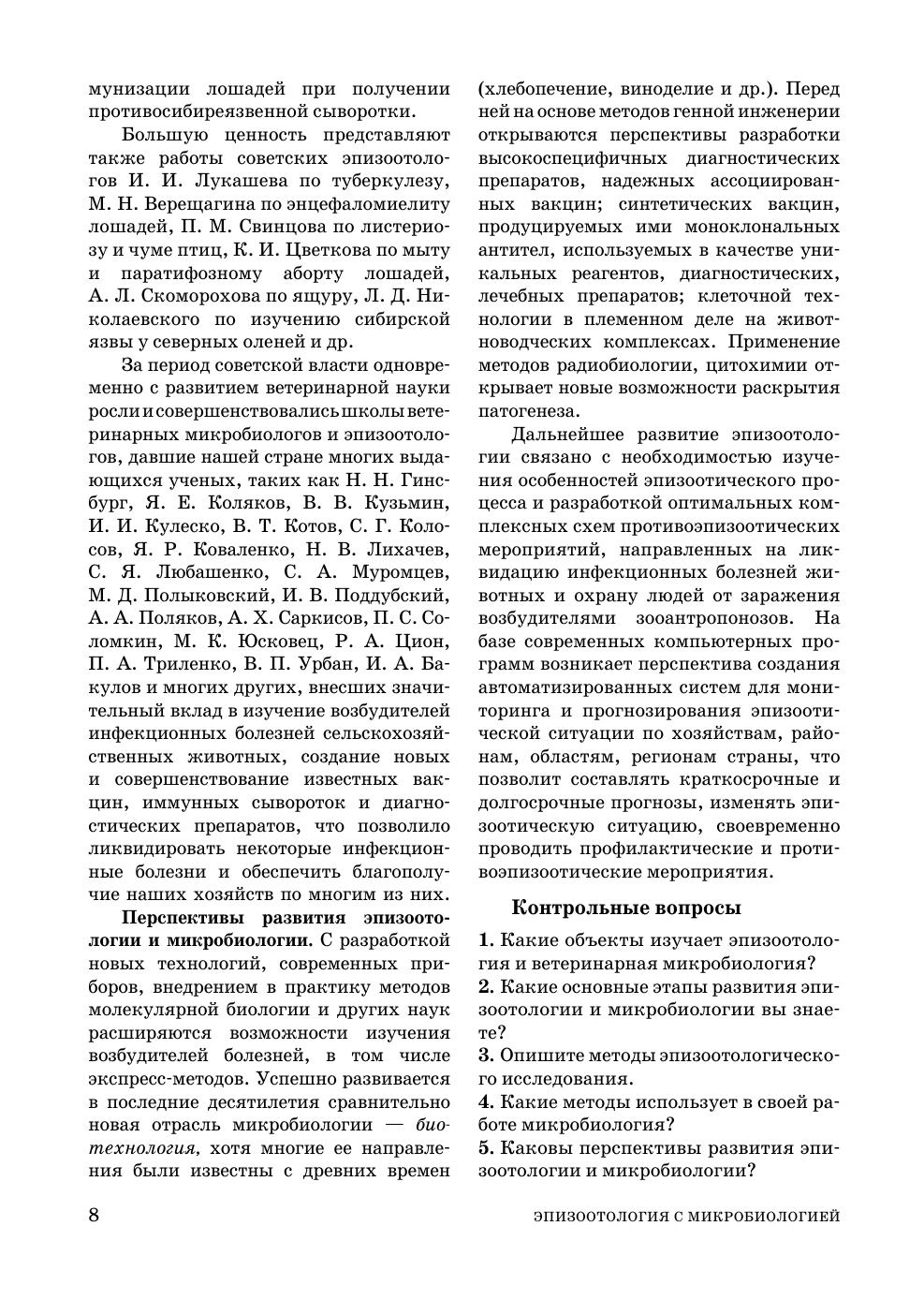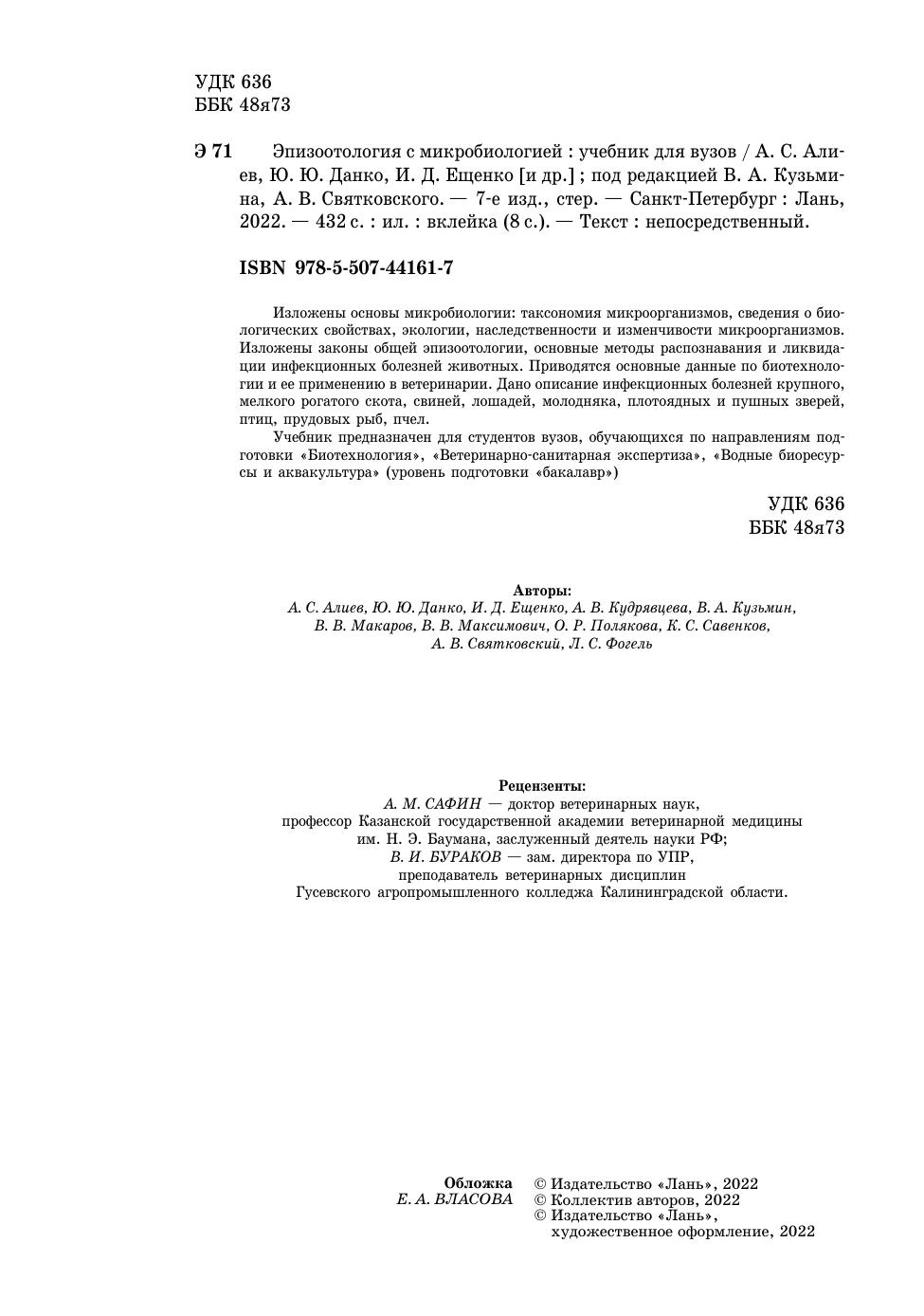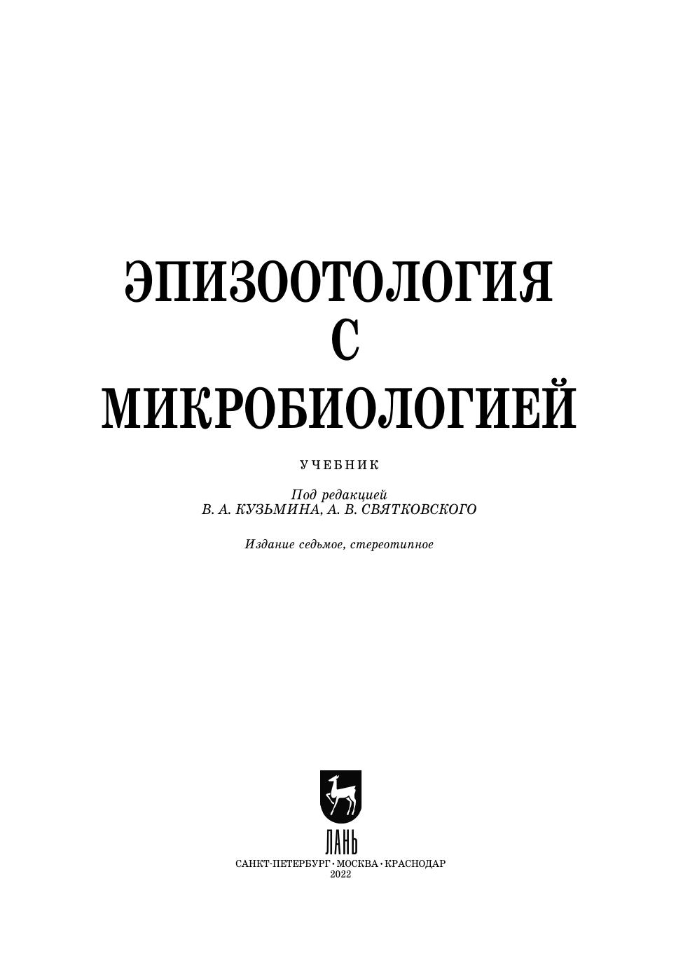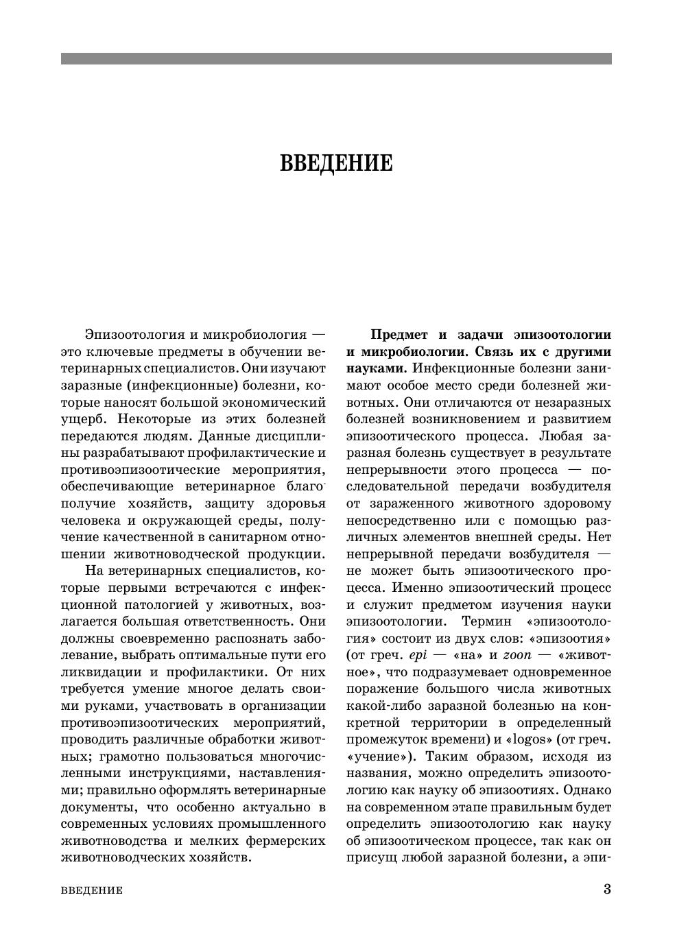 Изложены основы микробиологии: таксономия микроорганизмов, сведения о биологических свойствах, экологии, наследственности и изменчивости микроорганизмов. Изложены законы общей эпизоотологии, основные методы распознавания и ликвидации инфекционных болезней животных. Приводятся основные данные по биотехнологии и ее применению в ветеринарии. Дано описание инфекционных болезней крупного, мелкого рогатого скота, свиней, лошадей, молодняка, плотоядных и пушных зверей, птиц, прудовых рыб, пчел.Учебник предназначен для студентов вузов, обучающихся по направлениям подготовки «Биотехнология», «Ветеринарно-санитарная экспертиза», «Водные биоресурсы и аквакультура» (уровень подготовки «бакалавр»)