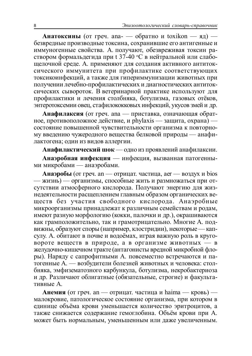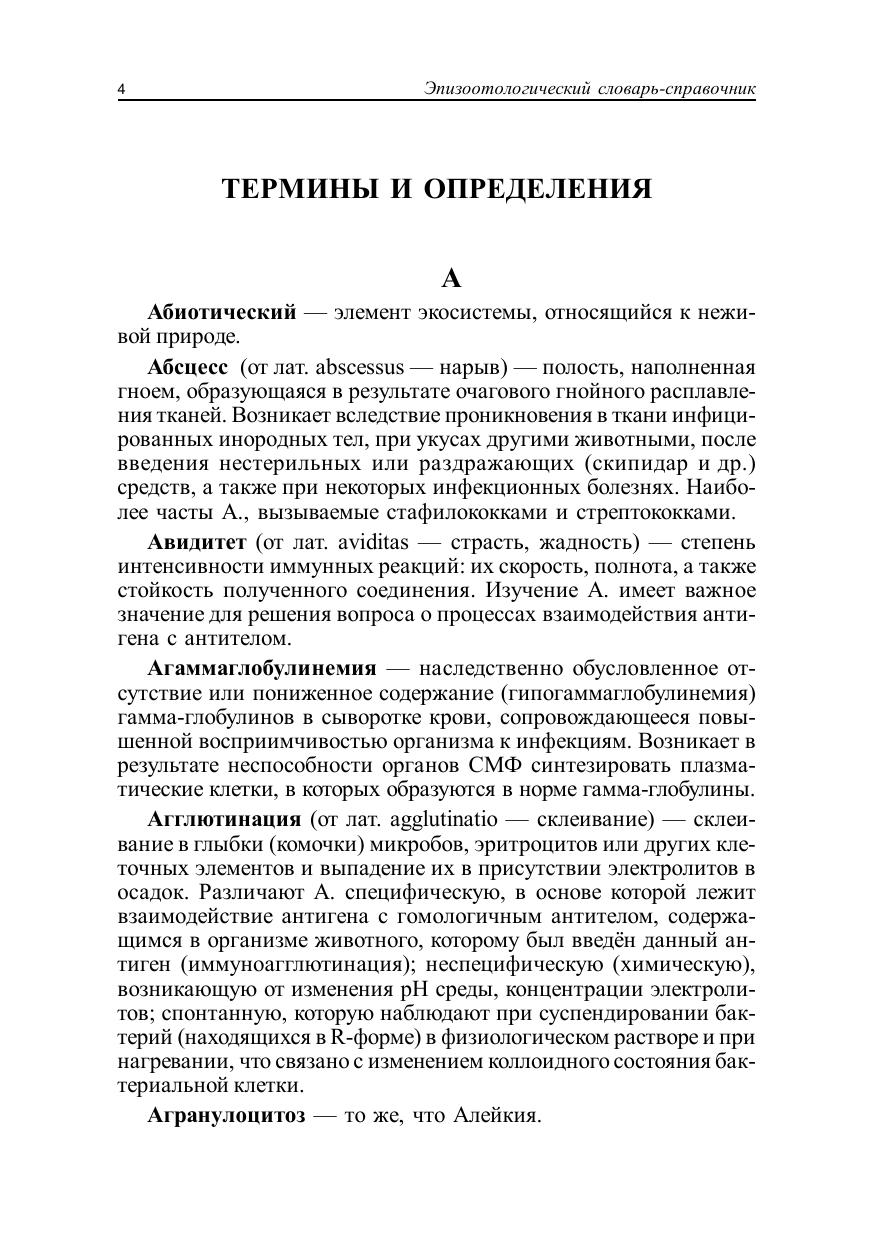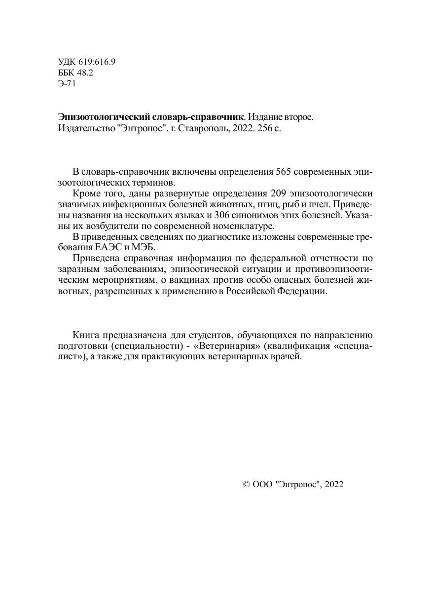 В словарь-справочник включены определения 565 современных эпизоотологических терминов. Кроме того, даны развернутые определения 209 эпизоотологически значимых инфекционных болезней животных, птиц, рыб и пчел. Приведены названия на нескольких языках и 306 синонимов этих болезней. Указаны их возбудители по современной номенклатуре. Вприведенных сведениях по диагностике изложены современные требования ЕАЭС и МЭБ. Приведена справочная информация по федеральной отчетности по заразным заболеваниям, эпизоотической ситуации и противоэпизоотическим мероприятиям, о вакцинах против особо опасных болезней животных, разрешенных к применению в Российской Федерации.