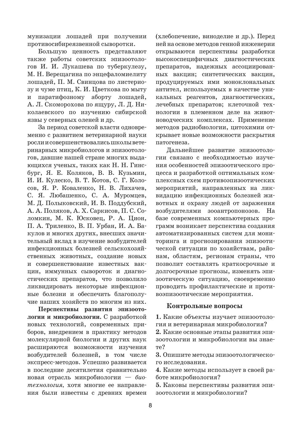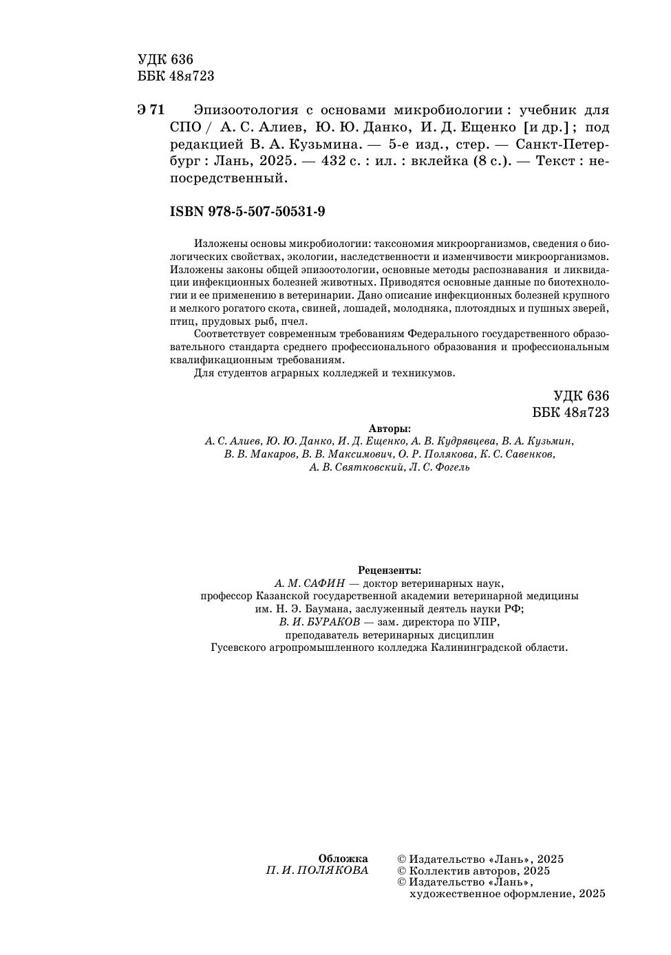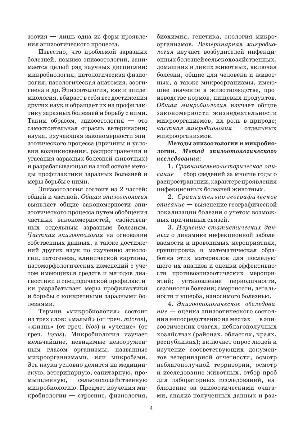 Изложены основы микробиологии: таксономия микроорганизмов, сведения о биологических свойствах, экологии, наследственности и изменчивости микроорганизмов. Изложены законы общей эпизоотологии, основные методы распознавания и ликвидации инфекционных болезней животных. Приводятся основные данные по биотехнологии и ее применению в ветеринарии. Дано описание инфекционных болезней крупного и мелкого рогатого скота, свиней, лошадей, молодняка, плотоядных и пушных зверей, птиц, прудовых рыб, пчел. Соответствует современным требованиям Федерального государственного образовательного стандарта среднего профессионального образования и профессиональным квалификационным требованиям. Для студентов аграрных колледжей и техникумов.