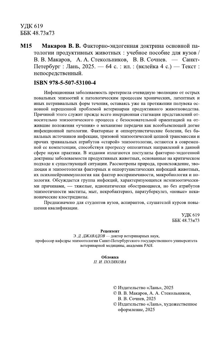 Инфекционная заболеваемость претерпела очевидную эволюцию от острых повальных эпизоотий к патологическим процессам хронических, латент-ных и иных нетривиальных форм течения, оставаясь уже на протяжении полувека основной нерешенной проблемой ветеринарии продуктивного животноводства. Причиной этого служит прежде всего инерционная стагнация представлений относительно эпизоотического процесса с безосновательной ориентацией на отжившие положения «учения» о механизме передачи как всеобъемлющей догме инфекционной патологии. Факторные и оппортунистические болезни, без банальных источников инфекции, тризовой эпизоотической цепной трансмиссии и прочих тривиальных атрибутов «старой» эпизоотологии, остаются в современной ее компетенции, способствуя прогрессу оппозитных направлений в данной сфере науки практики. В издании излагаются постулаты факторно-эндогенной доктрины заболеваемости продуктивных животных, основанные на критическом подходе к существующей ситуации. Рассмотрены природа, происхождение, эволюция и эпизоотология факторных и оппортунистических инфекций животных, их психонейроиммунология как фактор восприимчивости, микробиология и нозология. Обсуждается группа инфекций, характеризующихся неэпизоотическими причинами, тяжелые, идиопатически обостряющиеся, но без атрибутов эпизоотичности маститы, мыт, некробактериоз, паратуберкулез, «новые» неканонические клостридиозы. Предназначено для студентов вузов, аспирантов, слушателей курсов повышения квалификации.