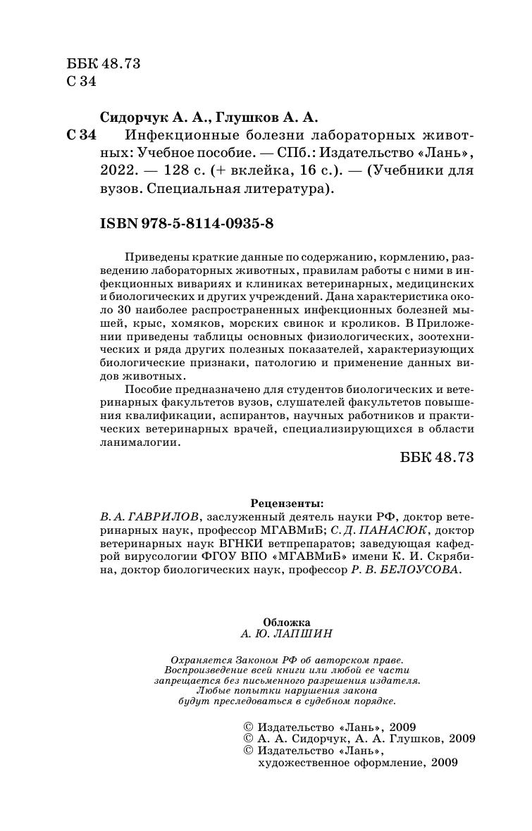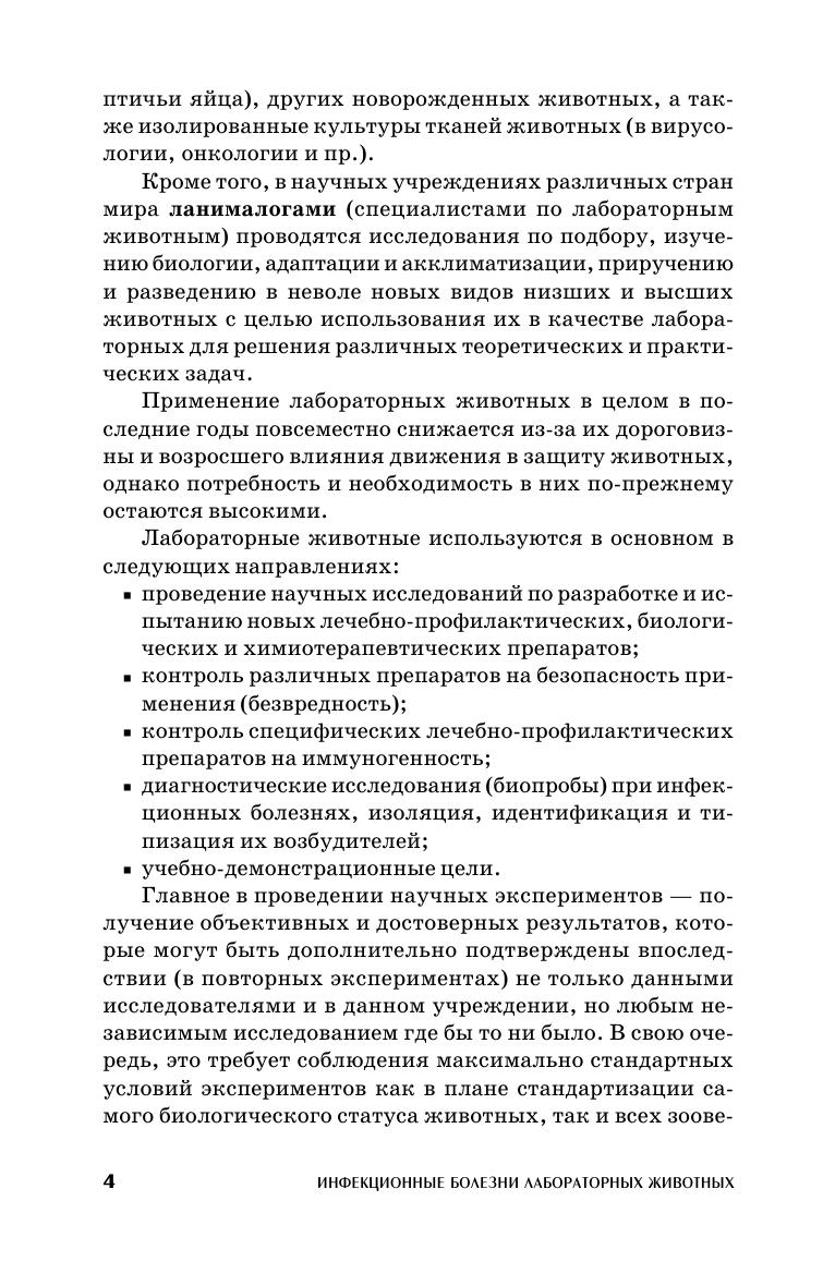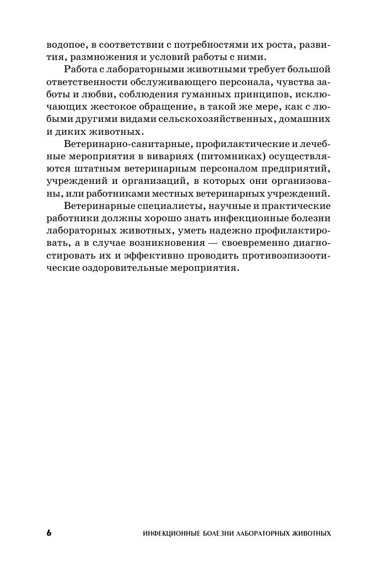 Приведены краткие данные по содержанию, кормлению, разведению лабораторных животных, правилам работы с ними в инфекционных вивариях и клиниках ветеринарных, медицинских и биологических и других учреждений и предприятий. Дана характеристика около 30 наиболее распространенных инфекционных болезней мышей, крыс, хомяков, морских свинок и кроликов. В Приложении приведены таблицы основных физиологических, зоотехнических и ряда других полезных показателей, характеризующих биологические признаки, патологию и применение данных видов животных. Пособие предназначено для студентов биологических и ветеринарных факультетов вузов, слушателей факультетов повышения квалификации, аспирантов, научных работников и практических ветеринарных врачей, специализирующихся в области ланималогии.