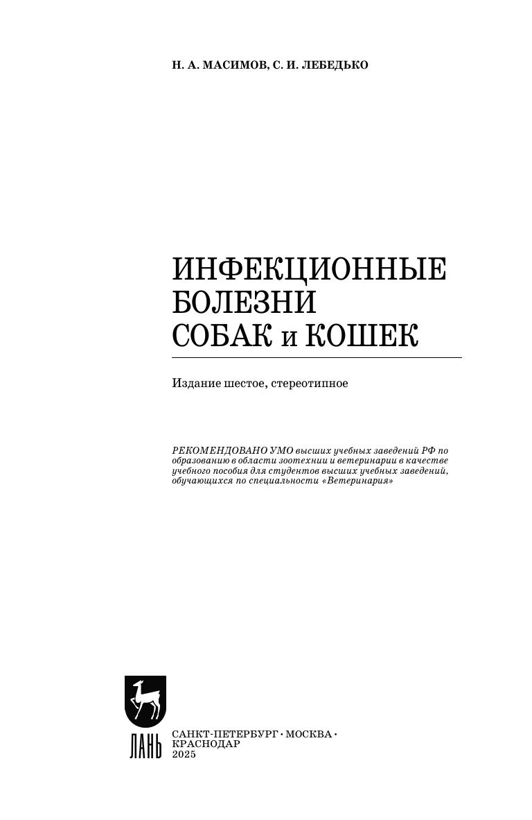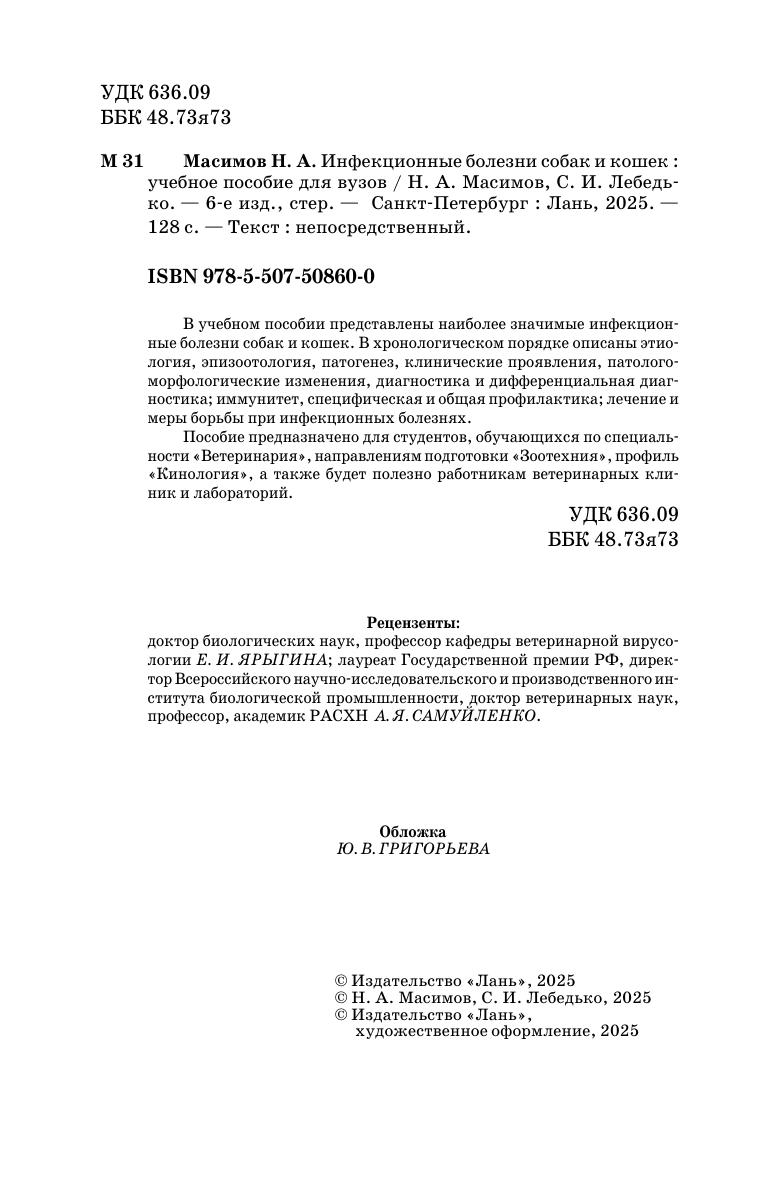 В учебном пособии представлены наиболее значимые инфекционные болезни собак и кошек. В хронологическом порядке описаны этиология, эпизоотология, патогенез, клинические проявления, патолого-морфологические изменения, диагностика и дифференциальная диагностика, иммунитет, специфическая и общая профилактика, лечение и меры борьбы при инфекционных болезнях. Пособие предназначено для студентов, обучающихся по специальности «Ветеринария», направлениям подготовки «Зоотехния», профиль «Кинология», а также будет полезно работникам ветеринарных клиник и лабораторий.