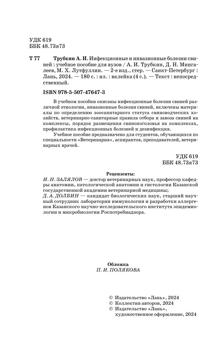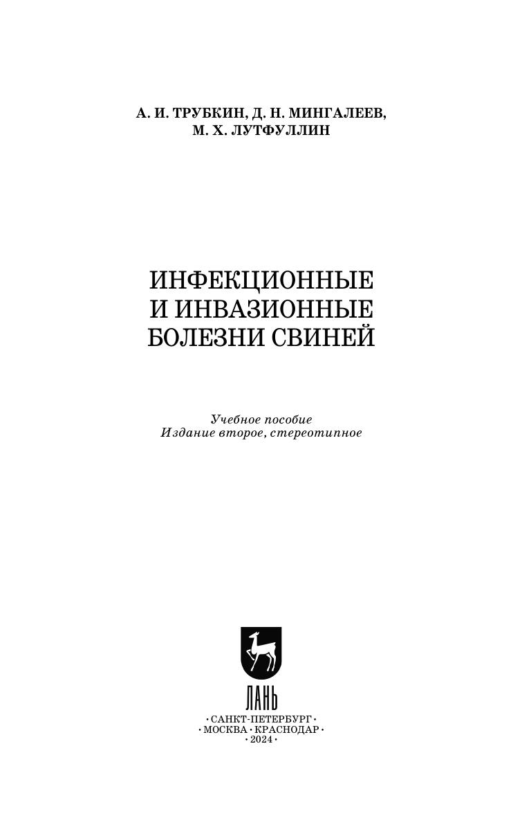 В учебном пособии описаны инфекционные болезни свиней различной этиологии, инвазионные болезни свиней, включены материалы по определению зоосанитарного статуса свиноводческих хозяйств, ветеринарно-санитарные правила отбора и завоза свиней на комплексы, порядок размещения свинопоголовья на комплексах, профилактика инфекционных болезней и дезинфекция. Учебное пособие предназначено для студентов, обучающихся по специальности «Ветеринария», аспирантов, преподавателей, ветеринарных врачей.