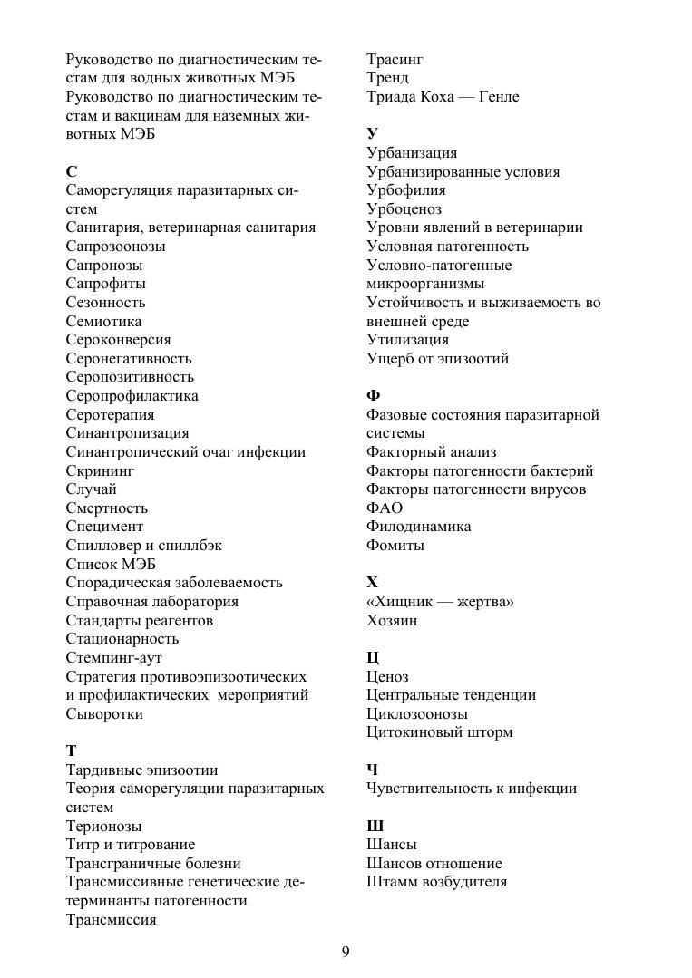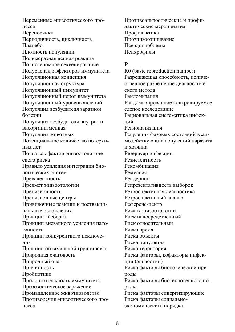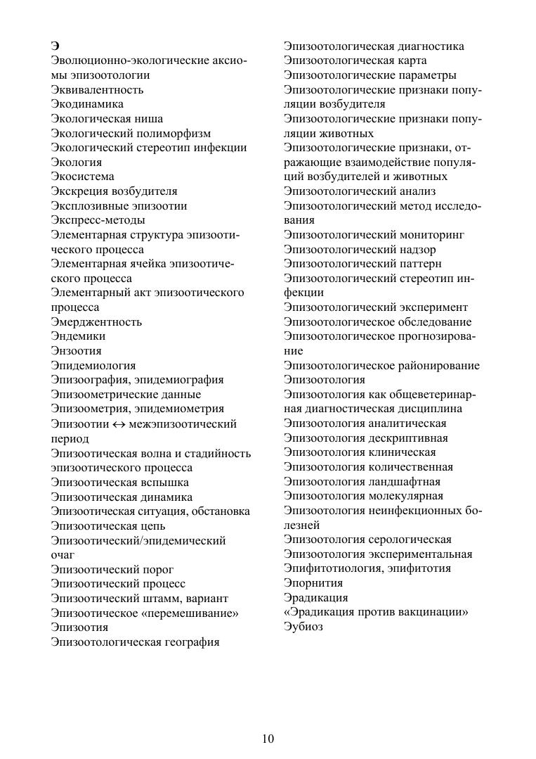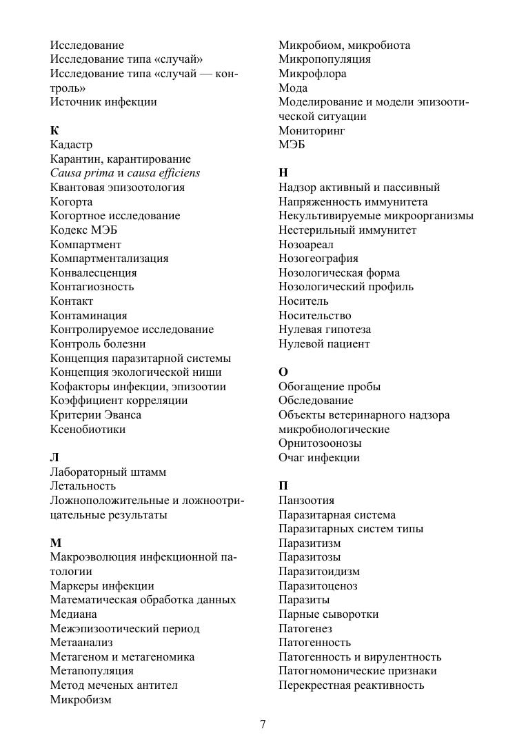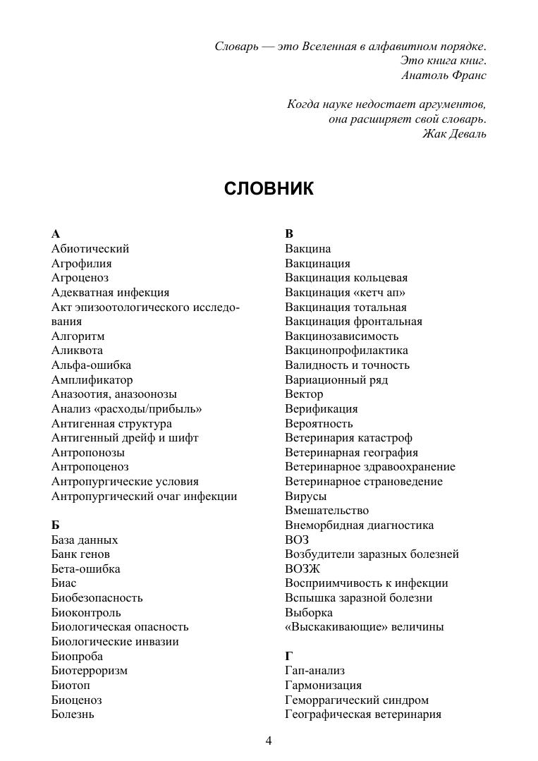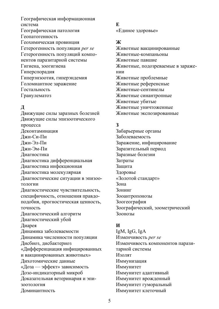 Цель настоящего издания — корректировка понятийного аппарата эпизоотологии как сферы профессиональной научной, практической деятельности и учебной дисциплины по специальности «Ветеринария». Справочник содержит около 500 актуальных терминов, гармонизированных с глоссариями Всемирной Организации Здравоохранения Животных (МЭБ) и различными современными терминологическими источниками по смежным направлениям науки, практики и профессионального образования (экология, эпидемиология, паразитология). Отдельные статьи общебиологического или малоизвестного порядка конкретизированы ссылками на авторские и иные подробные публикации, главным образом доступные в интернете, в необходимых случаях приведены англоязычные эквиваленты и иллюстрации (рисунки и таблицы), наглядно представляющие их семантику. Для многозначных понятий даются трактовки только в эпизоотологическом контексте. В качестве приложений приводятся современный Список МЭБ болезней животных, а также несколько последних примеров научной публицистики, освещающих прогресс знаний в ветеринарной биоэкологии инфекционных болезней, и перечень фундаментальных монографических терминологических изданий. Справочник предназначен для учащихся различного уровня — студентов, аспирантов, слушателей ФПК — как источник достоверных, аутентичных понятий в важном разделе дисциплин инфекционного профиля. Также будет полезен специалистам, интересующимся вопросами инфекционной патологии и эпизоотологии.