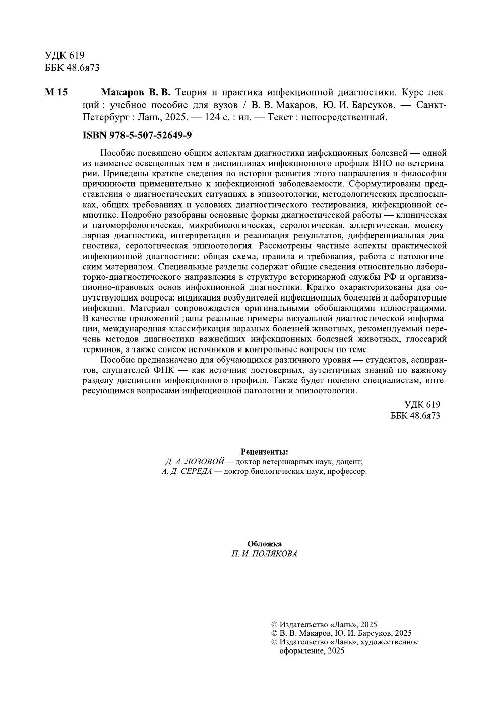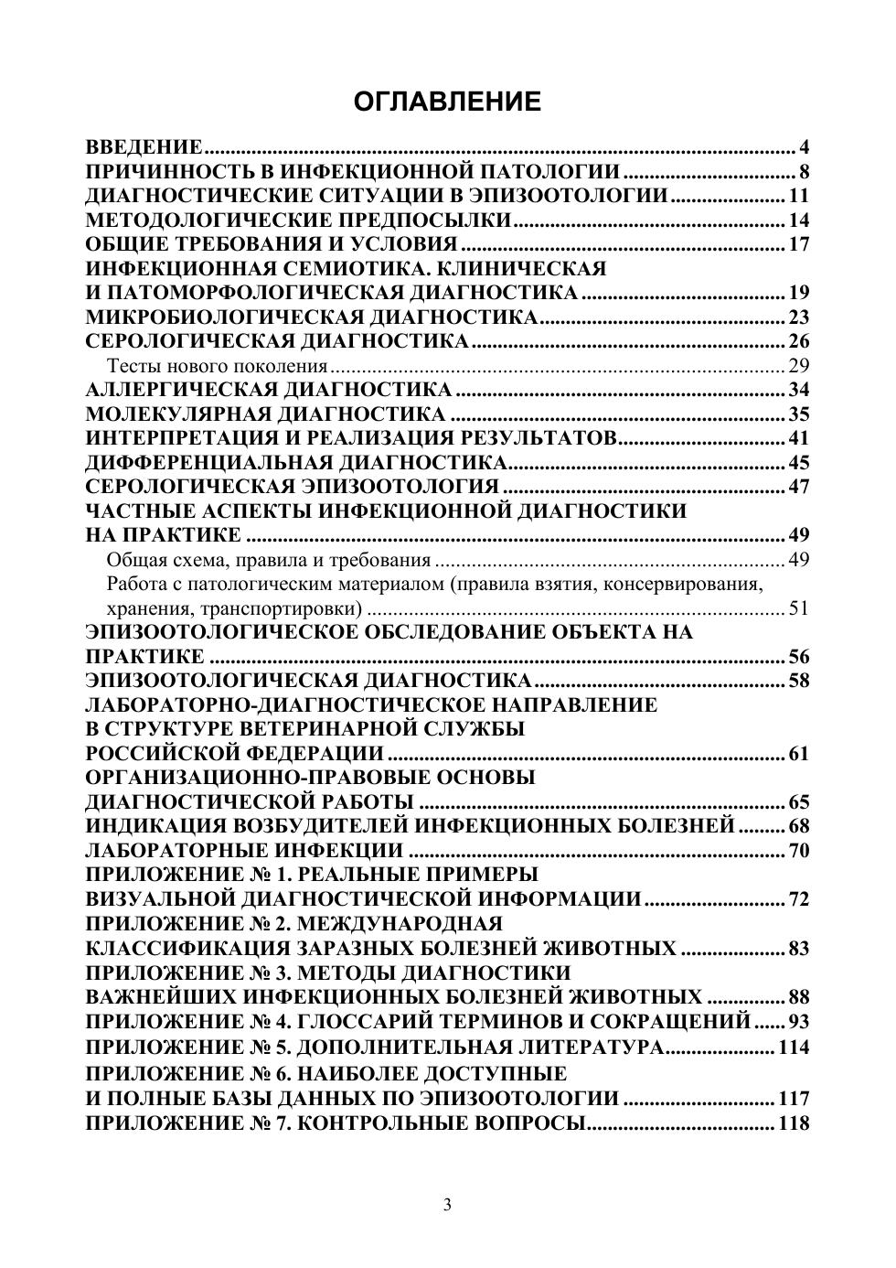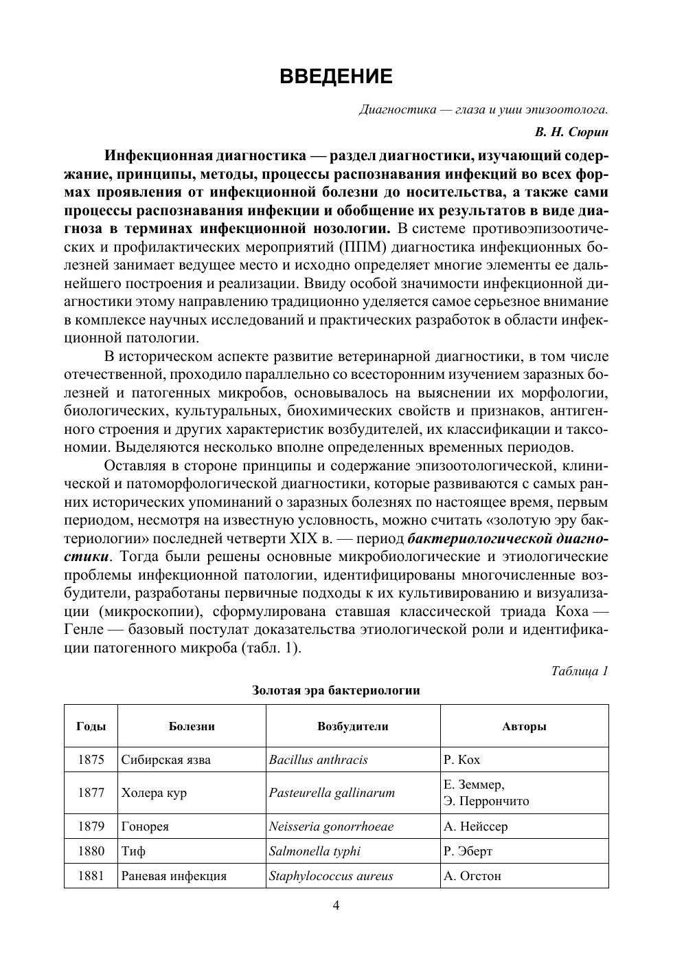Пособие посвящено общим аспектам диагностики инфекционных болезней — одной из наименее освещенных тем в дисциплинах инфекционного профиля ВПО по ветеринарии. Приведены краткие сведения по истории развития этого направления и философии причинности применительно к инфекционной заболеваемости. Сформулированы представления о диагностических ситуациях в эпизоотологии, методологических предпосылках, общих требованиях и условиях диагностического тестирования, инфекционной семиотике. Подробно разобраны основные формы диагностической работы — клиническая и патоморфологическая, микробиологическая, серологическая, аллергическая, молекулярная диагностика, интерпретация и реализация результатов, дифференциальная диагностика, серологическая эпизоотология. Рассмотрены частные аспекты практической инфекционной диагностики: общая схема, правила и требования, работа с патологическим материалом. Специальные разделы содержат общие сведения относительно лабораторно-диагностического направления в структуре ветеринарной службы РФ и организационно-правовых основ инфекционной диагностики. Кратко охарактеризованы два сопутствующих вопроса: индикация возбудителей инфекционных болезней и лабораторные инфекции. Материал сопровождается оригинальными обобщающими иллюстрациями. В качестве приложений даны реальные примеры визуальной диагностической информации, международная классификация заразных болезней животных, рекомендуемый перечень методов диагностики важнейших инфекционных болезней животных, глоссарий терминов, а также список источников и контрольные вопросы по теме. Пособие предназначено для обучающихся различного уровня — студентов, аспи-рантов, слушателей ФПК — как источник достоверных, аутентичных знаний по важ-ному разделу дисциплин инфекционного профиля. Также будет полезно специали-стам, интересующимся вопросами инфекционной патологии и эпизоотологии.