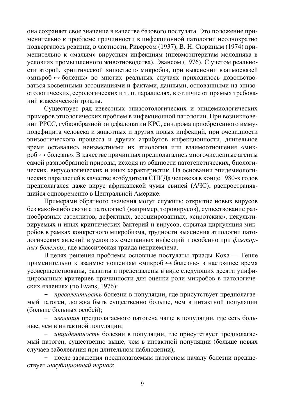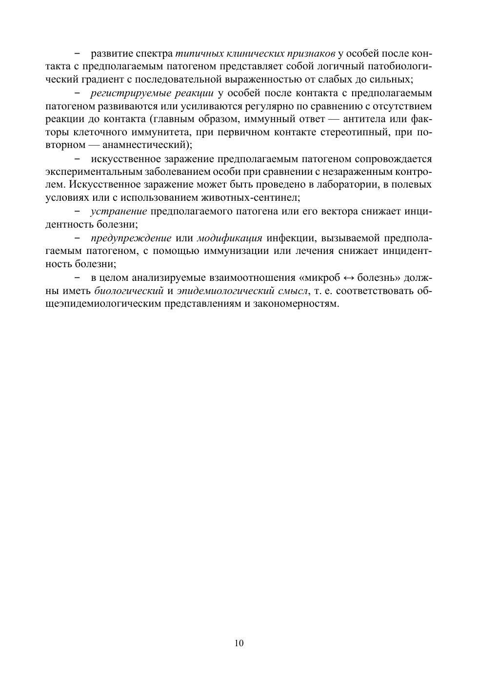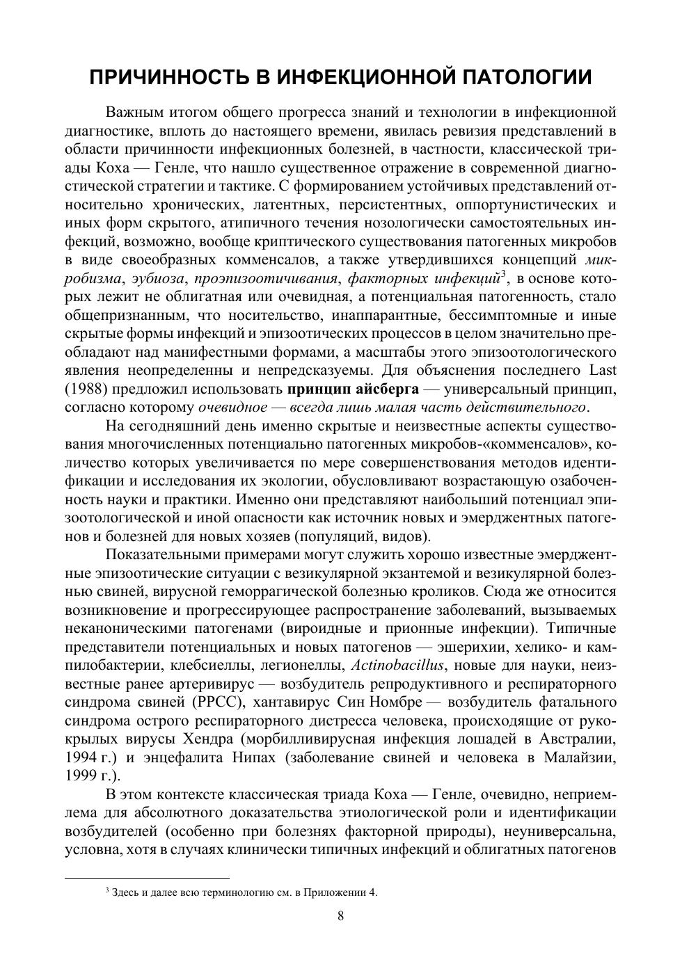 Пособие посвящено общим аспектам диагностики инфекционных болезней — одной из наименее освещенных тем в дисциплинах инфекционного профиля ВПО по ветеринарии. Приведены краткие сведения по истории развития этого направления и философии причинности применительно к инфекционной заболеваемости. Сформулированы представления о диагностических ситуациях в эпизоотологии, методологических предпосылках, общих требованиях и условиях диагностического тестирования, инфекционной семиотике. Подробно разобраны основные формы диагностической работы — клиническая и патоморфологическая, микробиологическая, серологическая, аллергическая, молекулярная диагностика, интерпретация и реализация результатов, дифференциальная диагностика, серологическая эпизоотология. Рассмотрены частные аспекты практической инфекционной диагностики: общая схема, правила и требования, работа с патологическим материалом. Специальные разделы содержат общие сведения относительно лабораторно-диагностического направления в структуре ветеринарной службы РФ и организационно-правовых основ инфекционной диагностики. Кратко охарактеризованы два сопутствующих вопроса: индикация возбудителей инфекционных болезней и лабораторные инфекции. Материал сопровождается оригинальными обобщающими иллюстрациями. В качестве приложений даны реальные примеры визуальной диагностической информации, международная классификация заразных болезней животных, рекомендуемый перечень методов диагностики важнейших инфекционных болезней животных, глоссарий терминов, а также список источников и контрольные вопросы по теме. Пособие предназначено для обучающихся различного уровня — студентов, аспи-рантов, слушателей ФПК — как источник достоверных, аутентичных знаний по важ-ному разделу дисциплин инфекционного профиля. Также будет полезно специали-стам, интересующимся вопросами инфекционной патологии и эпизоотологии.