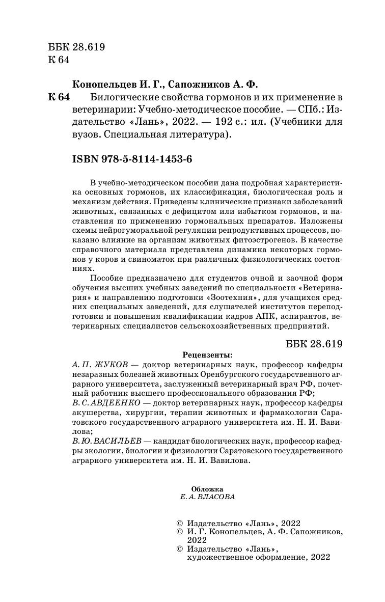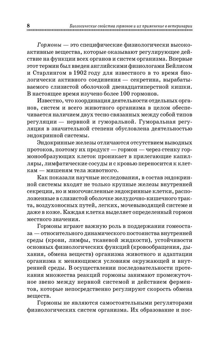 В учебно-методическом пособии дана подробная характеристика основных гормонов, их классификация, биологическая роль и механизм действия. Приведены клинические признаки заболеваний животных, связанных с дефицитом или избытком гормонов, и наставления по применению гормональных препаратов. Изложены схемы нейрогуморальной регуляции репродуктивных процессов, показано влияние на организм животных фитоэстрогенов. В качестве справочного материала представлена динамика некоторых гормонов у коров и свиноматок при различных физиологических состояниях. Учебно-методическое пособие предназначено для студентов очной и заочной форм обучения высших учебных заведений специальности «Ветеринария» и направления подготовки «Зоотехния», для учащихся средних специальных заведений, для слушателей институтов переподготовки и повышения квалификации кадров АПК, аспирантов, ветеринарных специалистов сельскохозяйственных предприятий.
