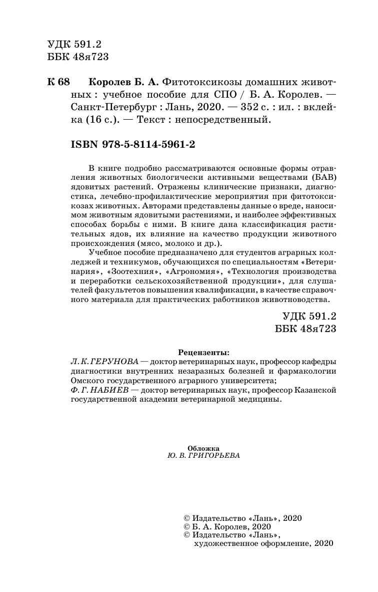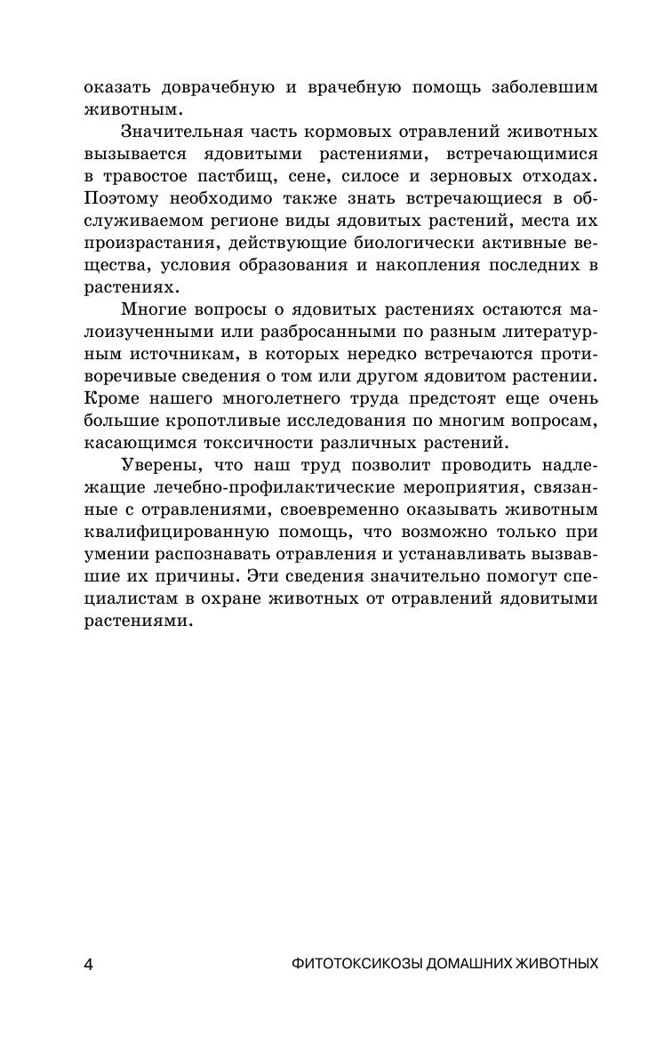В книге подробно рассматриваются основные формы отравления животных биологически активными веществами (БАВ) ядовитых растений. Отражены клинические признаки, диагностика, лечебно-профилактические мероприятия при фитотоксикозах животных. Авторами представлены данные о вреде, наносимом животным ядовитыми растениями, и наиболее эффективных способах борьбы с ними. В книге дана классификация растительных ядов, их влияние на качество продукции животного происхождения (мясо, молоко и др.).
