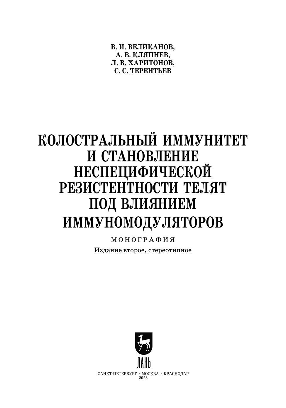 В настоящей монографии представлены сведения о современных ветеринарных препаратах, применяемых в животноводстве для повышения неспецифической резистентности и сохранности новорожденных и телят молочного периода выращивания. На основе обобщения литературных данных и результатов собственных исследований авторов изложены современные представления о физиологическом состоянии, колостральном иммунитете и становлении неспецифической резистентности телят раннего постнатального периода онтогенеза после применения Тимогена, Полиоксидония, Ронколейкина и Синэстрола 2% коровам-матерям перед отелом. Монография предназначена для практических ветеринарных врачей, научных работников и студентов вузов, обучающихся по специальности «Ветеринария», аспирантов, обучающихся по специальности «Ветеринария и зоотехния».