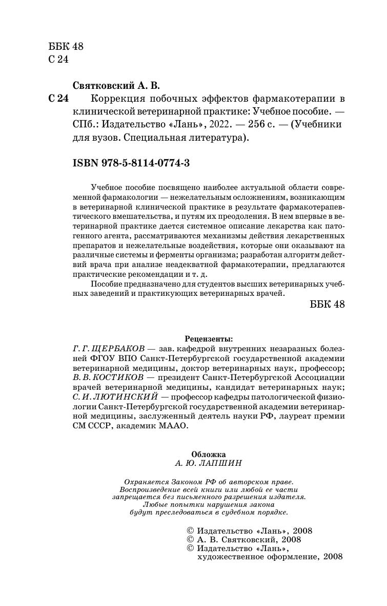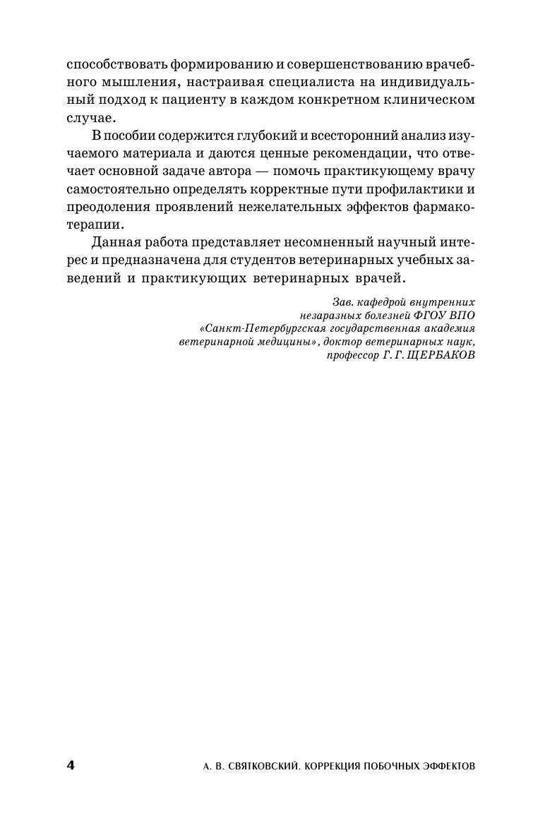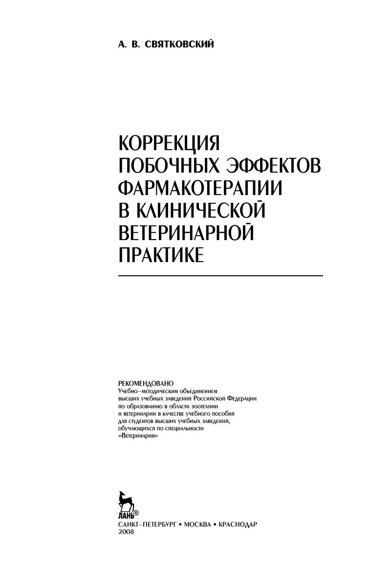 Учебное пособие посвящено наиболее актуальной области современной фармакологии — нежелательным осложнениям, возникающим в ветеринарной клинической практике в результате фармакотерапевтического вмешательства, и путям их преодоления. В нем впервые в ветеринарной практике дается системное описание лекарства как патогенного агента, рассматриваются механизмы действия лекарственных препаратов и нежелательные воздействия, которые они оказывают на различные системы и ферменты организма, разработан алгоритм действий врача при анализе неадекватной фармакотерапии, предлагаются практические рекомендации и т. д. Пособие предназначено для студентов высших ветеринарных учебных заведений и практикующих ветеринарных врачей.