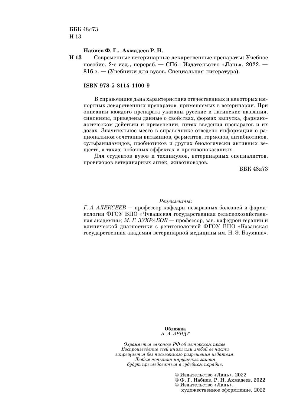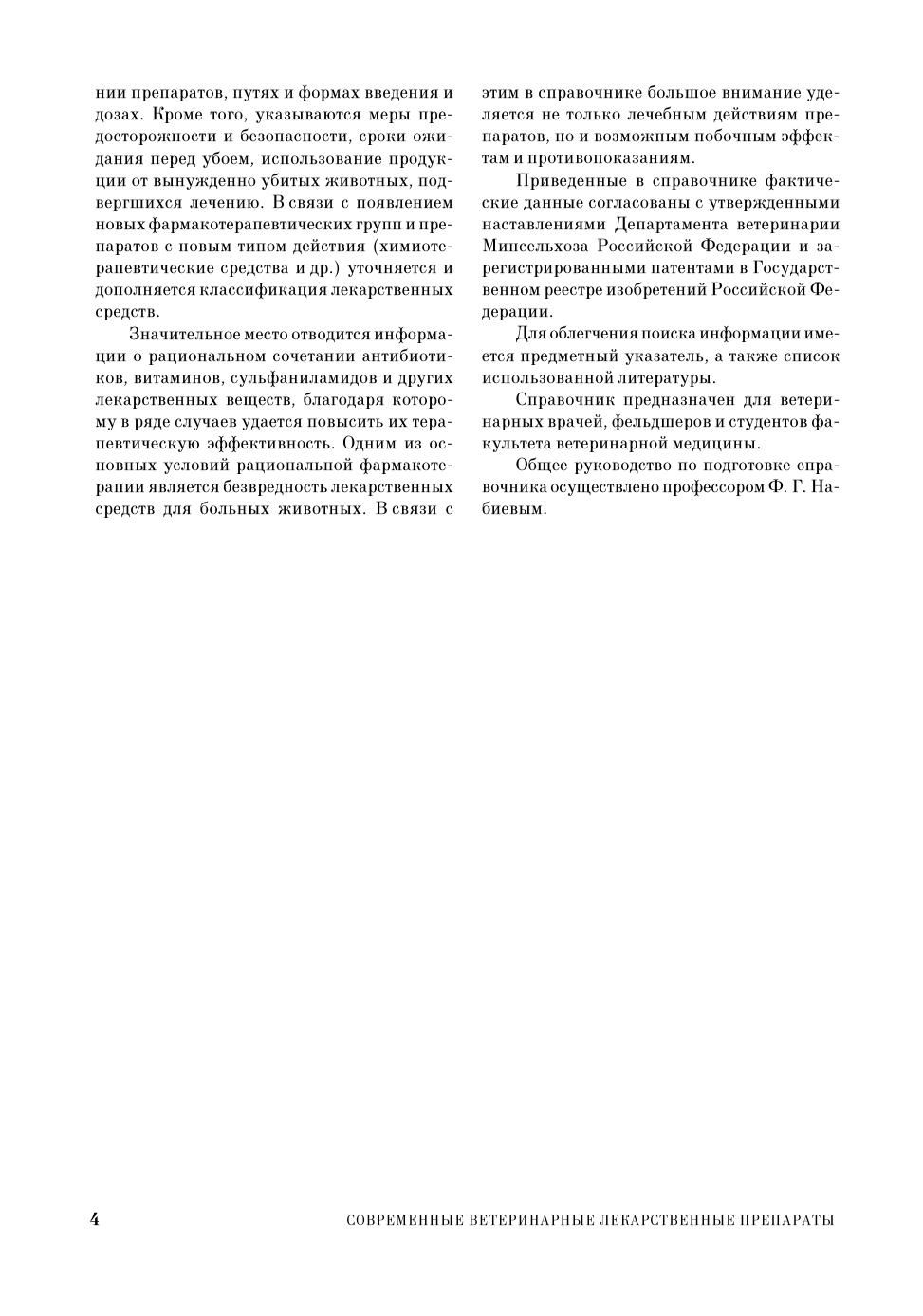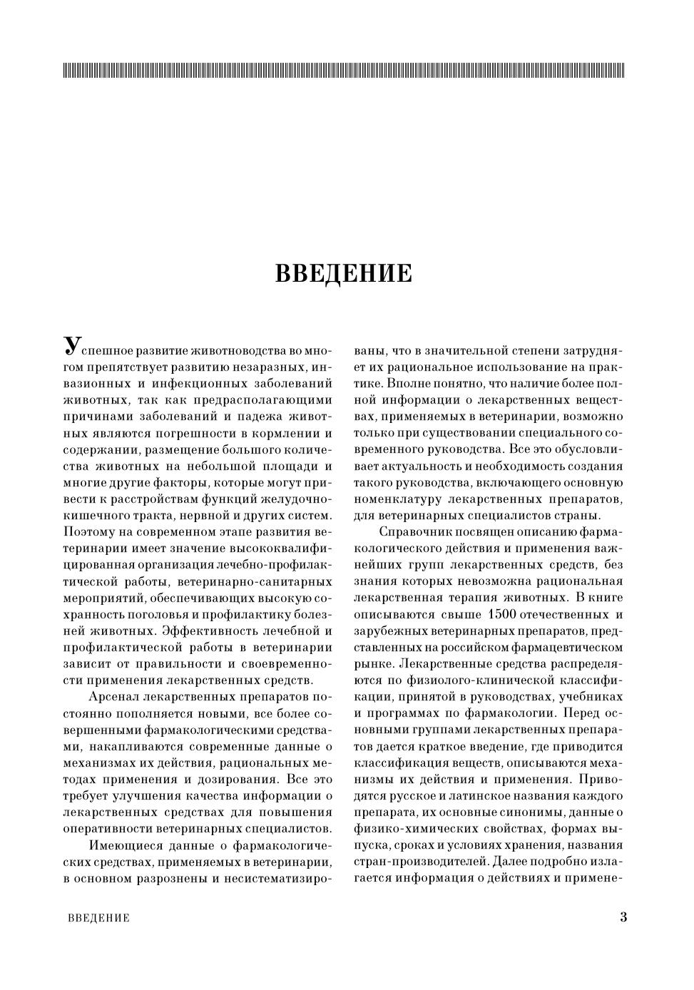 В справочнике дана характеристика отечественных и некоторых импортных лекарственных препаратов, применяемых в ветеринарии. При описании каждого препарата указаны русские и латинские названия, синонимы, приведены данные о свойствах, формах выпуска, фармакологическом действии и применении, путях введения препаратов и их дозах. Значительное место в справочнике отведено информации о рациональном сочетании витаминов, ферментов, гормонов, антибиотиков, сульфаниламидов, пробиотиков и других биологически активных веществ, а также побочных эффектах и противопоказаниях. Для студентов вузов и техникумов, ветеринарных специалистов, провизоров ветеринарных аптек, животноводов.