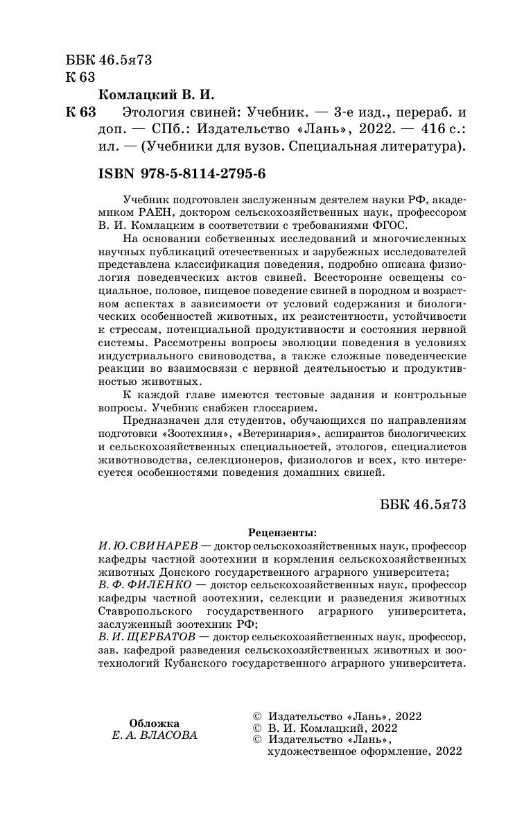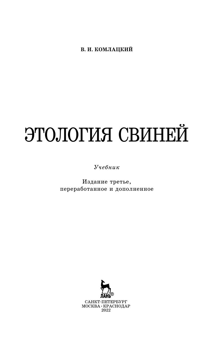 Учебник подготовлен заслуженным деятелем науки РФ, академиком РАЕН, доктором сельскохозяйственных наук, профессором В. И. Комлацким в соответствии с требованиями ФГОС. На основании собственных исследований и многочисленных научных публикаций отечественных и зарубежных исследователей представлена классификация поведения, подробно описана физиология поведенческих актов свиней. Всесторонне освещены социальное, половое, пищевое поведение свиней в породном и возрастном аспектах в зависимости от условий содержания и биологических особенностей животных, их резистентности, устойчивости к стрессам, потенциальной продуктивности и состояния нервной системы. Рассмотрены вопросы эволюции поведения в условиях индустриального свиноводства, а также сложные поведенческие реакции во взаимосвязи с нервной деятельностью и продуктивностью животных. К каждой главе имеются тестовые задания и контрольные вопросы. Учебник снабжен глоссарием. Предназначен для студентов, обучающихся по направлениям подготовки «Зоотехния», «Ветеринария», аспирантов биологических и сельскохозяйственных специальностей, этологов, специалистов животноводства, селекционеров, физиологов и всех, кто интересуется особенностями поведения домашних свиней.