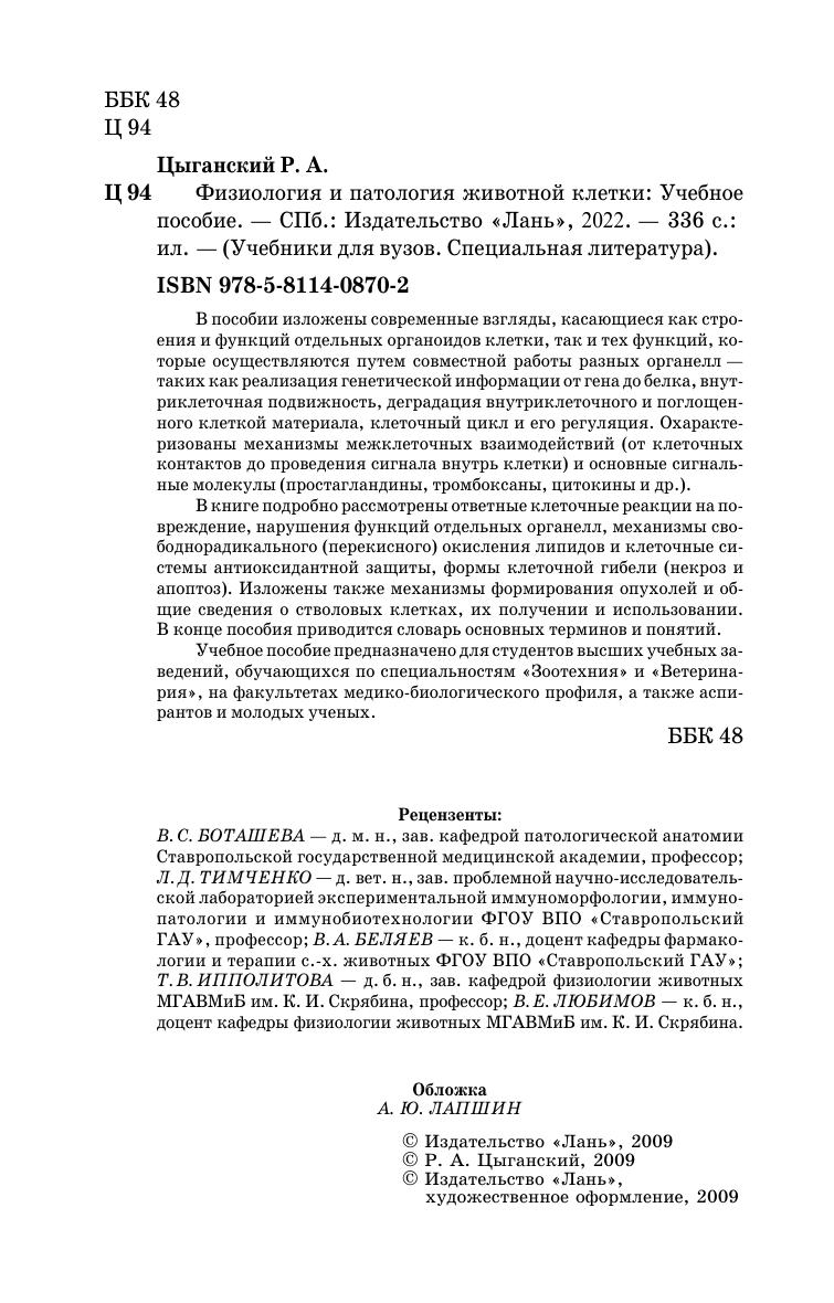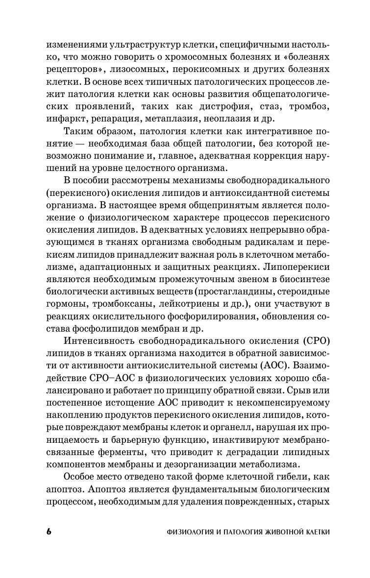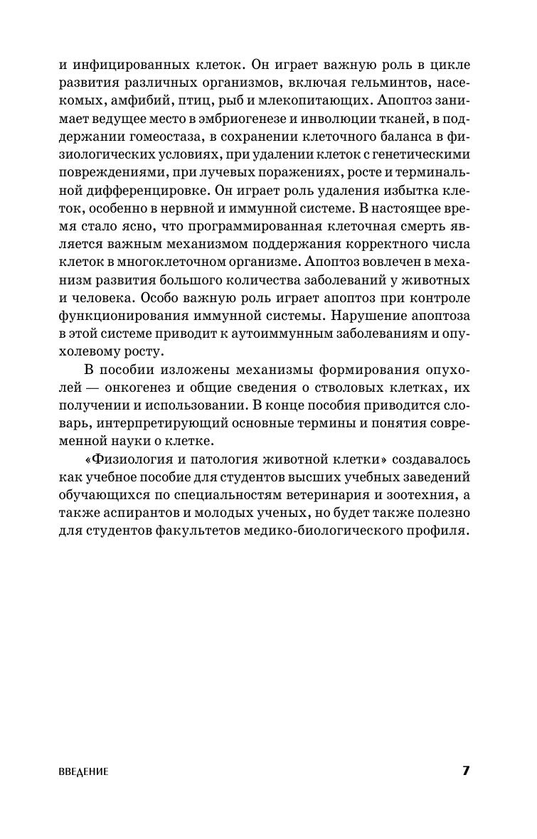 В пособии изложены современные взгляды, касающиеся как строения и функций отдельных органоидов клетки, так и тех функций, которые осуществляются путем совместной работы разных органелл — таких как реализация генетической информации от гена до белка, внутриклеточная подвижность, деградация внутриклеточного и поглощенного клеткой материала, клеточный цикл и его регуляция. Охарактеризованы механизмы межклеточных взаимодействий (от клеточных контактов до проведения сигнала внутрь клетки) и основные сигнальные молекулы (простагландины, тромбоксаны, цитокины и др.). В книге подробно рассмотрены ответные клеточные реакции на повреждение, нарушения функций отдельных органелл, механизмы свободнорадикального (перекисного) окисления липидов и клеточные системы антиоксидантной защиты, формы клеточной гибели (некроз и апоптоз). Изложены также механизмы формирования опухолей и общие сведения о стволовых клетках, их получении и использовании. В конце пособия приводится словарь основных терминов и понятий. Учебное пособие предназначено для студентов высших учебных заведений обучающихся по специальностям «Зоотехния» и «Ветеринария», на факультетах медико-биологического профиля, а также аспирантам и молодым ученым.