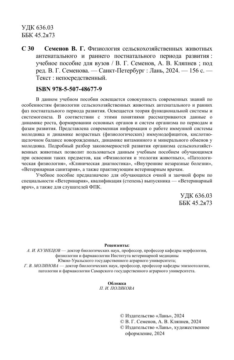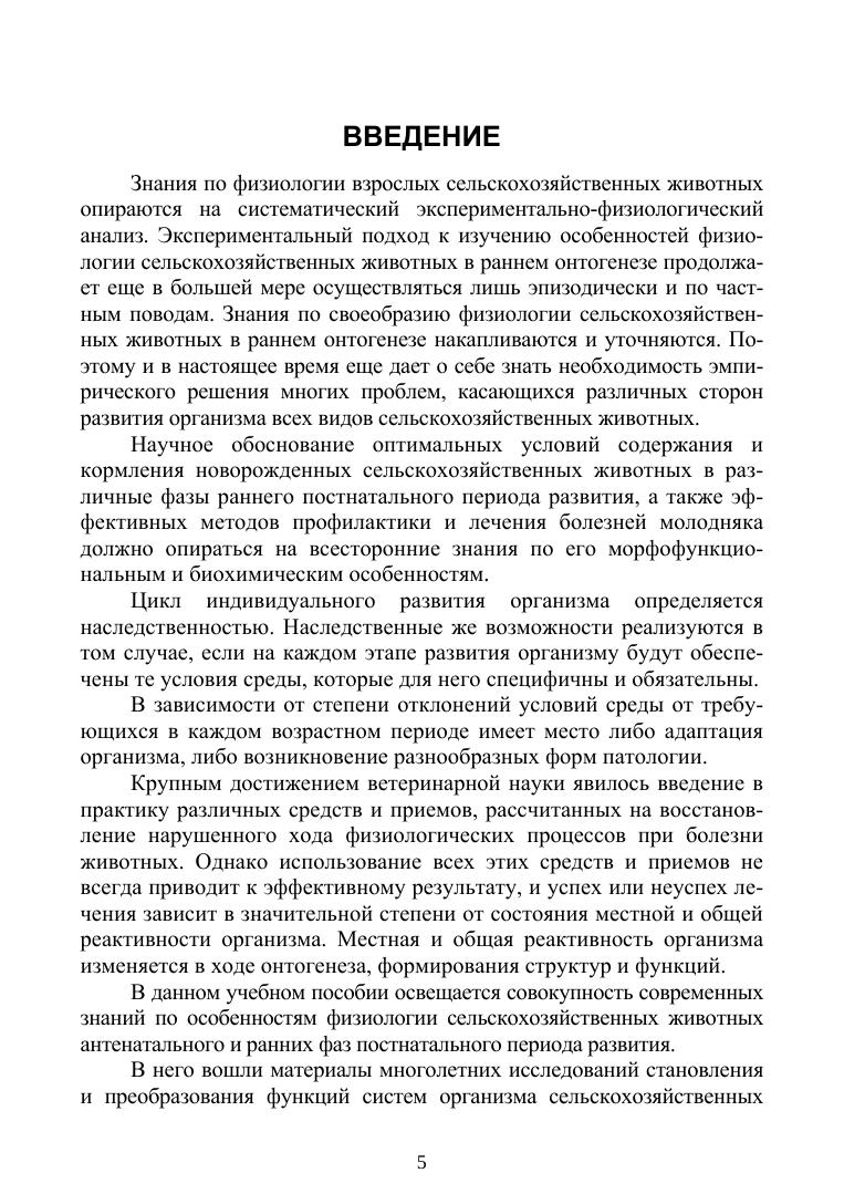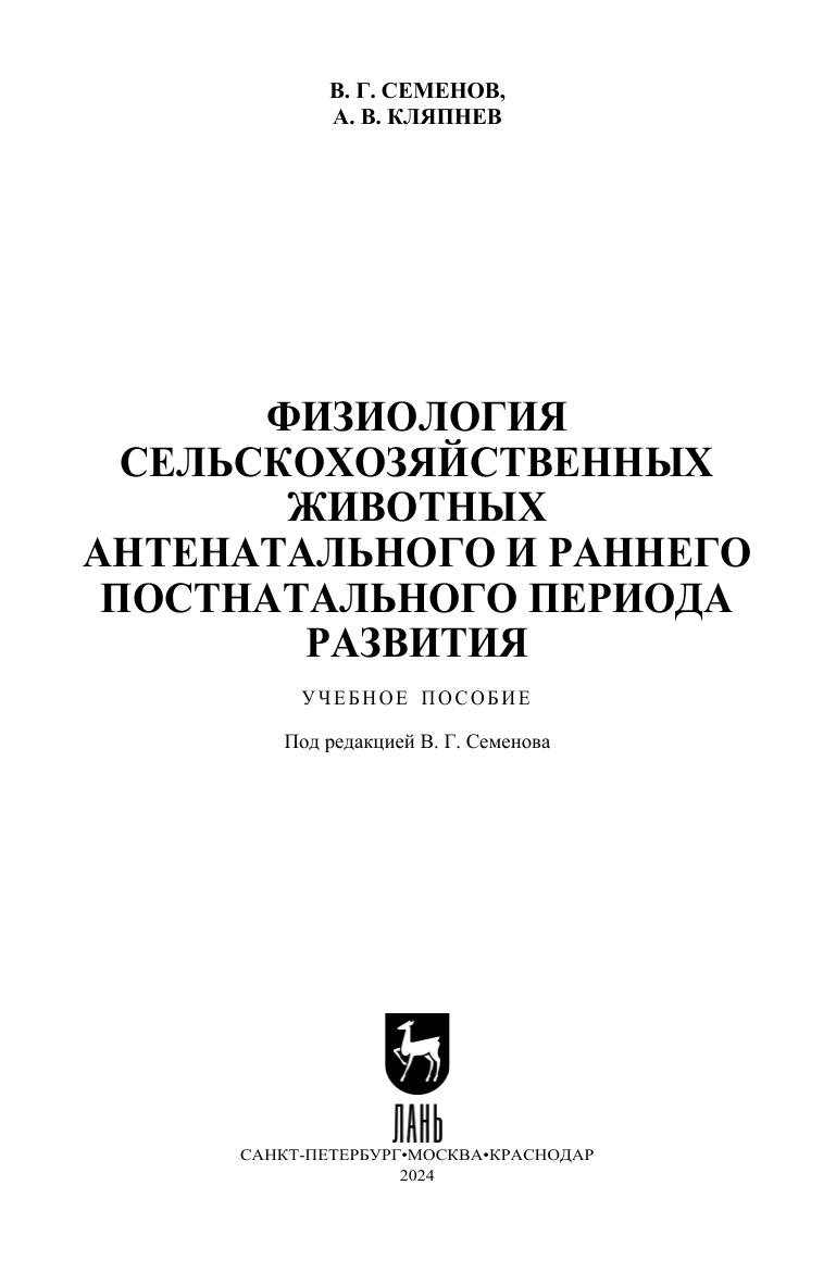 В данном учебном пособии освещается совокупность современных знаний по особенностям физиологии сельскохозяйственных животных антенатального и ранних фаз постнатального периода развития. Освещается теория функциональной системы и системогенеза. В соответствии с этими понятиями рассматриваются данные о динамике роста, формировании основных органов и систем организма по периодам и фазам развития. Представлена современная информация о работе иммунной системы молодняка и динамике возрастных (физиологических) иммунодефицитов, кислотно-щелочном балансе новорожденных, динамике витаминного и минерального обменов у молодняка. Подробный разбор закономерностей развития организма сельскохозяйственных животных позволит пользоваться данным учебным пособием обучающимся при освоении таких предметов, как «Физиология и этология животных», «Патологическая физиология», «Клиническая диагностика», «Внутренние незаразные болезни», «Ветеринарная санитария», а также практикующим ветеринарным врачам. Учебное пособие предназначено для обучающихся очной и заочной форм по специальности «Ветеринария», квалификация (степень) выпускника — «Ветеринарный врач», а также для слушателей ФПК.