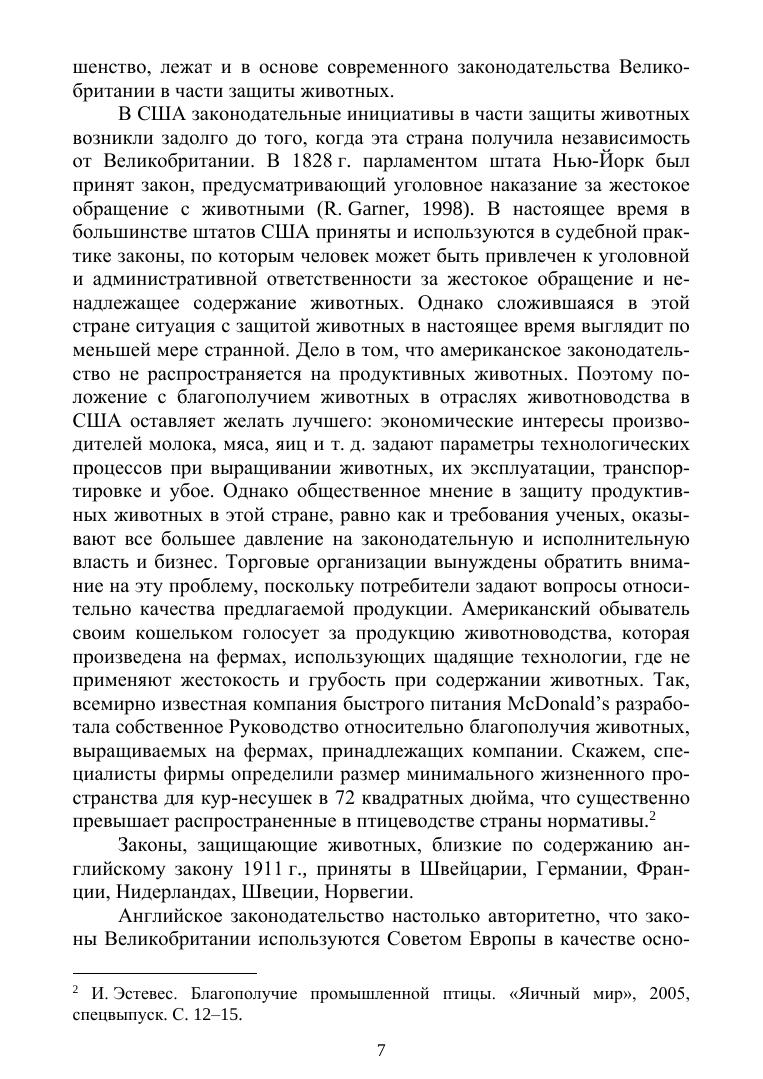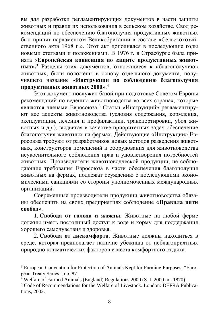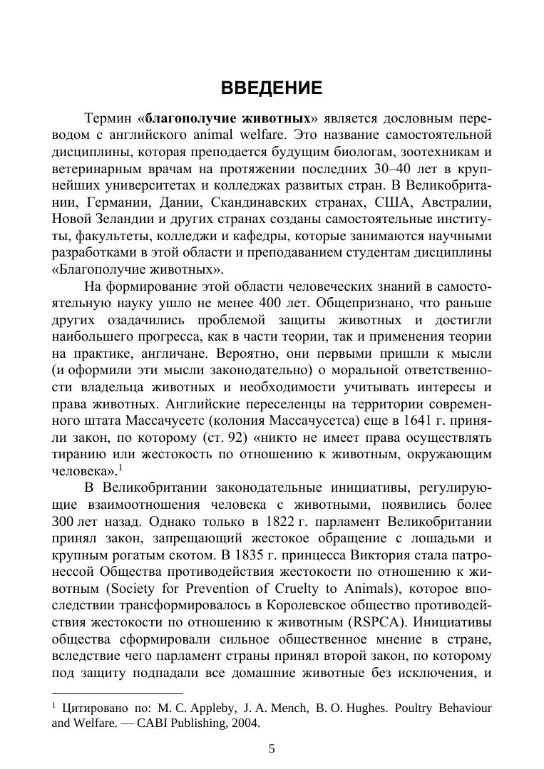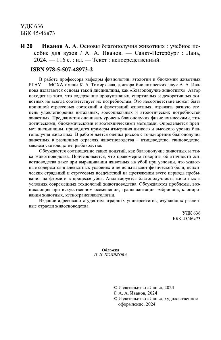 В работе профессора кафедры физиологии, этологии и биохимии животных РГАУ — МСХА имени К. А. Тимирязева, доктора биологических наук А. А. Ива-нова излагаются основы такой дисциплины, как «Благополучие животных». Автор исходит из того, что содержание продуктивных, спортивных и декоративных жи-вотных не всегда соответствует их потребностям. Это несоответствие может быть причиной стрессовых состояний и фрустраций животных, отражать разную сте-пень удовлетворения витальных, зоосоциальных и этологических потребностей животных. Предлагается оценивать уровень благополучия физиологическими, этологическими, биохимическими и зоотехническими методами. Определяется предмет дисциплины, приводятся примеры измерения низкого и высокого уровня благополучия животных. В работе дается оценка рисков с точки зрения благопо-лучия животных в различных отраслях животноводства – птицеводстве, свиновод-стве, мясном скотоводстве, рыбоводстве. Обсуждается соотношение таких понятий, как благополучие животных и эти-ка животноводства. Подчеркивается, что правомерно говорить об этичности жи-вотноводства даже при выращивании животных на убой при условии, что живот-ные содержатся в адекватных условиях и не испытывают физической боли, психи-ческих страданий и стрессовых воздействий на протяжении всего периода пребы-вания на ферме и в процессе убоя. Анализируется благополучность животных в условиях современных технологий животноводства. Обсуждаются проблемы, воз-никающие при искусственном осеменении, трансплантации эмбрионов, клониро-вании животных, ксенотрансплантологии. Издание адресовано студентам аграрных университетов, изучающих различ-ные отрасли животноводства.
