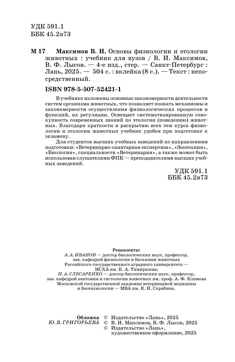 В учебнике изложены основные закономерности деятельности систем организма животных, что позволяет познать механизмы и закономерности осуществления физиологических процессов и функций, их регуляции. Освещает систематизированную совокупность современных знаний по этологии (поведению) животных. Благодаря краткости и раскрытию всех тем курса физиологии и этологии животных учебник удобен при подготовке к экзамену. Для студентов высших учебных заведений по направлениям подготовки: «Ветеринарно-санитарная экспертиза», «Зоотехния», «Биология», специальности «Ветеринария», а также может быть использован слушателями ФПК — преподавателями высших учебных заведений.