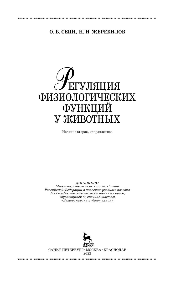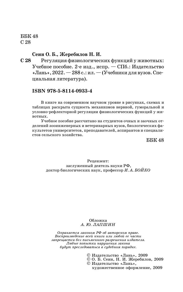 В книге на современном научном уровне в рисунках, схемах и таблицах раскрыта сущность механизмов нервной, гуморальной и условно-рефлекторной регуляции физиологических функций у животных. Учебное пособие рассчитано на студентов очных и заочных отделений зооинженерных и ветеринарных вузов, биологических факультетов университетов, преподавателей, аспирантов и специалистов сельского хозяйства.