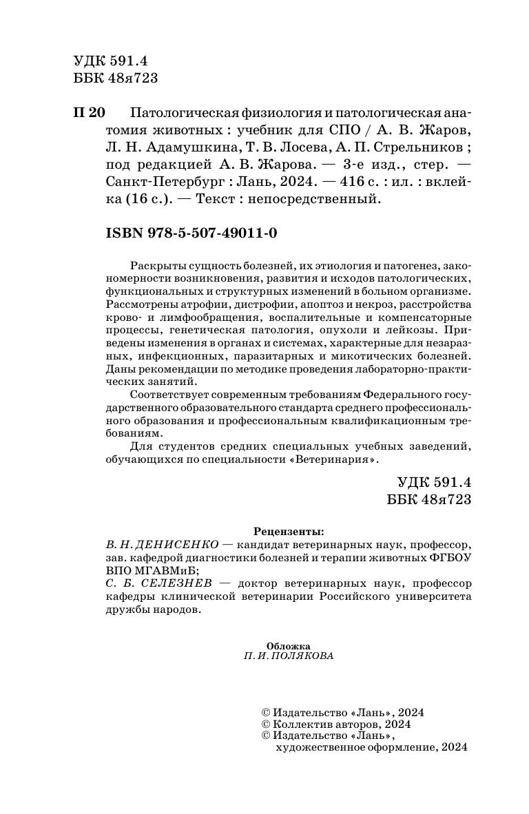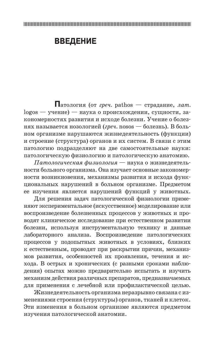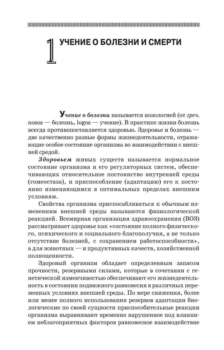Раскрыты сущность болезни, ее этиология и патогенез, закономерности возникновения, развития и исходов патологических, функциональных и структурных изменений в больном организме. Рассмотрены атрофии, дистрофии, апоптоз и некроз, расстройства крово- и лимфообращения, воспалительные и компенсаторные процессы, генетическая патология, опухоли и лейкозы. Приведены изменения в органах и системах, характерные для незаразных, инфекционных, паразитарных и микотических болезней. Даны рекомендации по методике проведения лабораторно-практических занятий. Соответствует современным требованиям Федерального государственного образовательного стандарта среднего профессионального образования и профессиональным квалификационным требованиям. Для студентов средних специальных учебных заведений, обучающихся по специальности «Ветеринария».