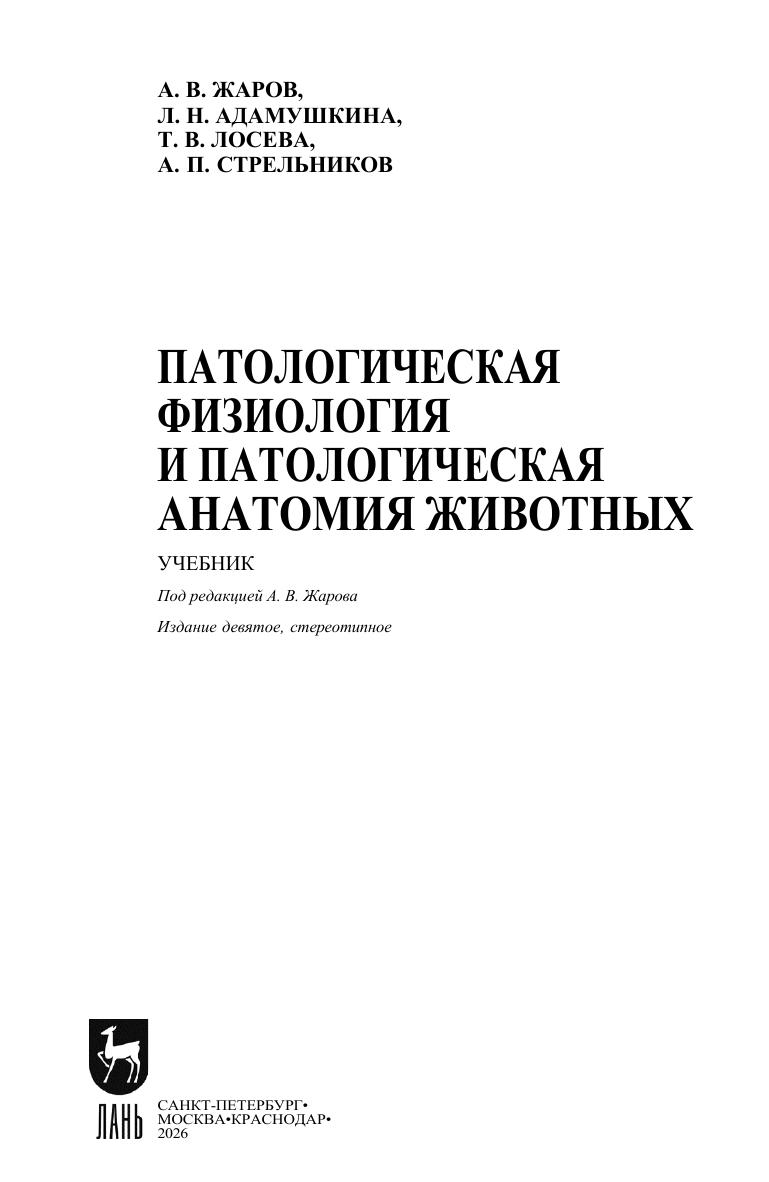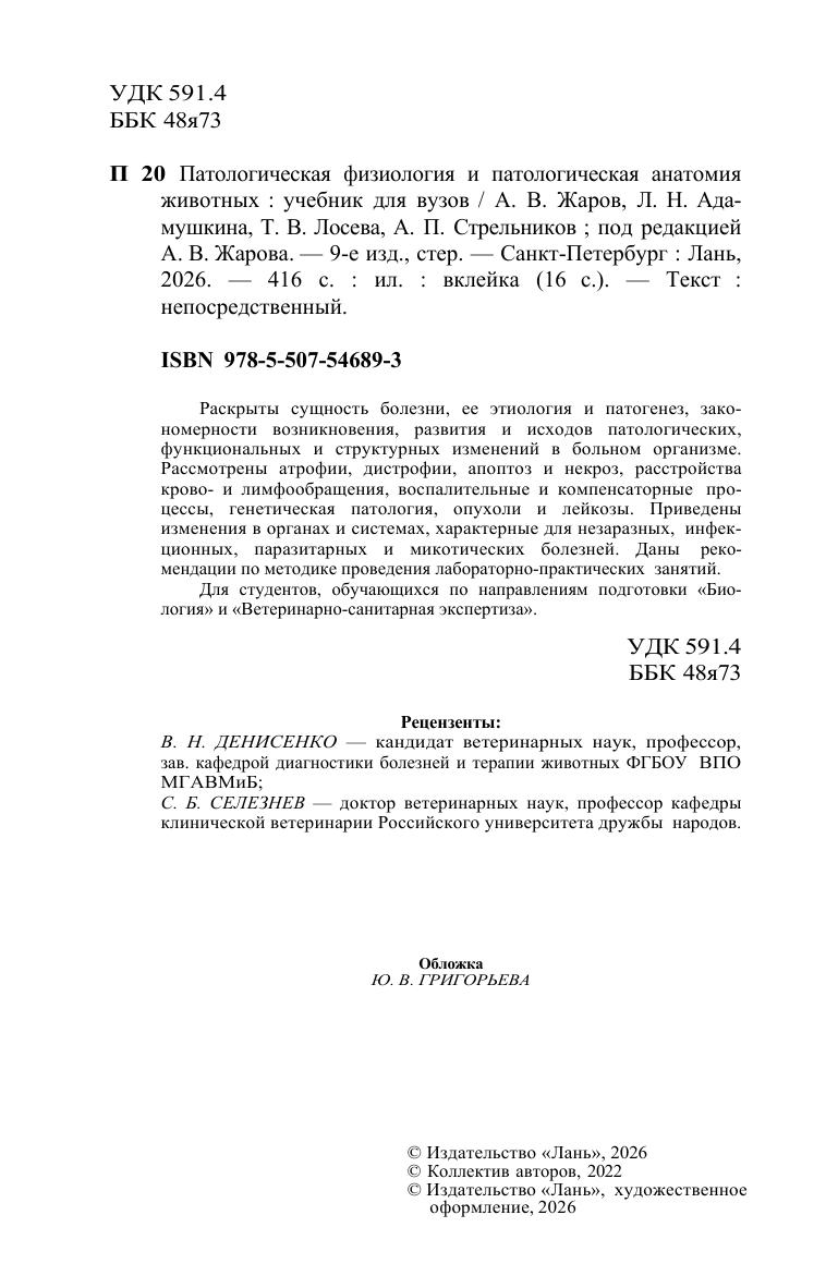 Раскрыты сущность болезни, ее этиология и патогенез, закономерности возникновения, развития и исходов патологических, функциональных и структурных изменений в больном организме. Рассмотрены атрофии, дистрофии, апоптоз и некроз, расстройства крово- и лимфообращения, воспалительные и компенсаторные процессы, генетическая патология, опухоли и лейкозы. Приведены изменения в органах и системах, характерные для незаразных, инфекционных, паразитарных и микотических болезней. Даны рекомендации по методике проведения лабораторно-практических занятий. Для студентов, обучающихся по направлениям подготовки «Биология» и «Ветеринарно-санитарная экспертиза».