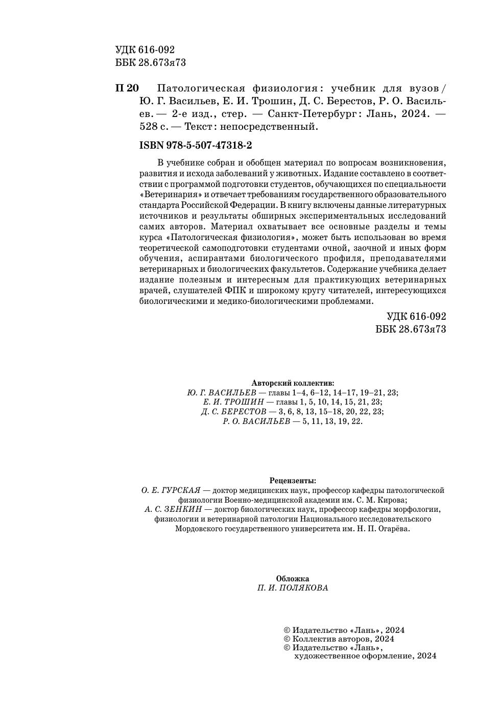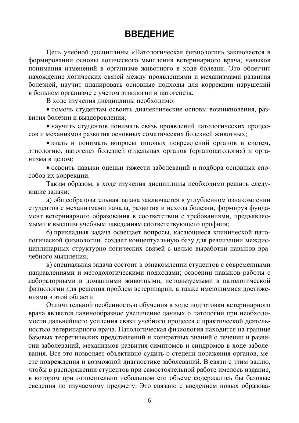 В учебнике собран и обобщен материал по вопросам возникновения, развития и исхода заболеваний у животных. Издание составлено в соотвествии с программой подготовки студентов, обучающихся по специальности «Ветеринария» и отвечает требованиям государственного образовательного стандарта Российской Федерации. В книгу включены данные литературных источников и результаты обширных экспериментальных исследований самих авторов. Материал охватывает все основные разделы и темы курса «Патологическая физиология», может быть использован во время теоретической самоподготовки студентами очной, заочной и иных форм обучения, аспирантами биологического профиля, преподавателями ветеринарных и биологических факультетов. Содержание учебника делает издание полезным и интересным для практикующих ветеринарных врачей, слушателей ФПК и широкому кругу читателей, интересующихся биологическими и медико-биологическими проблемами.