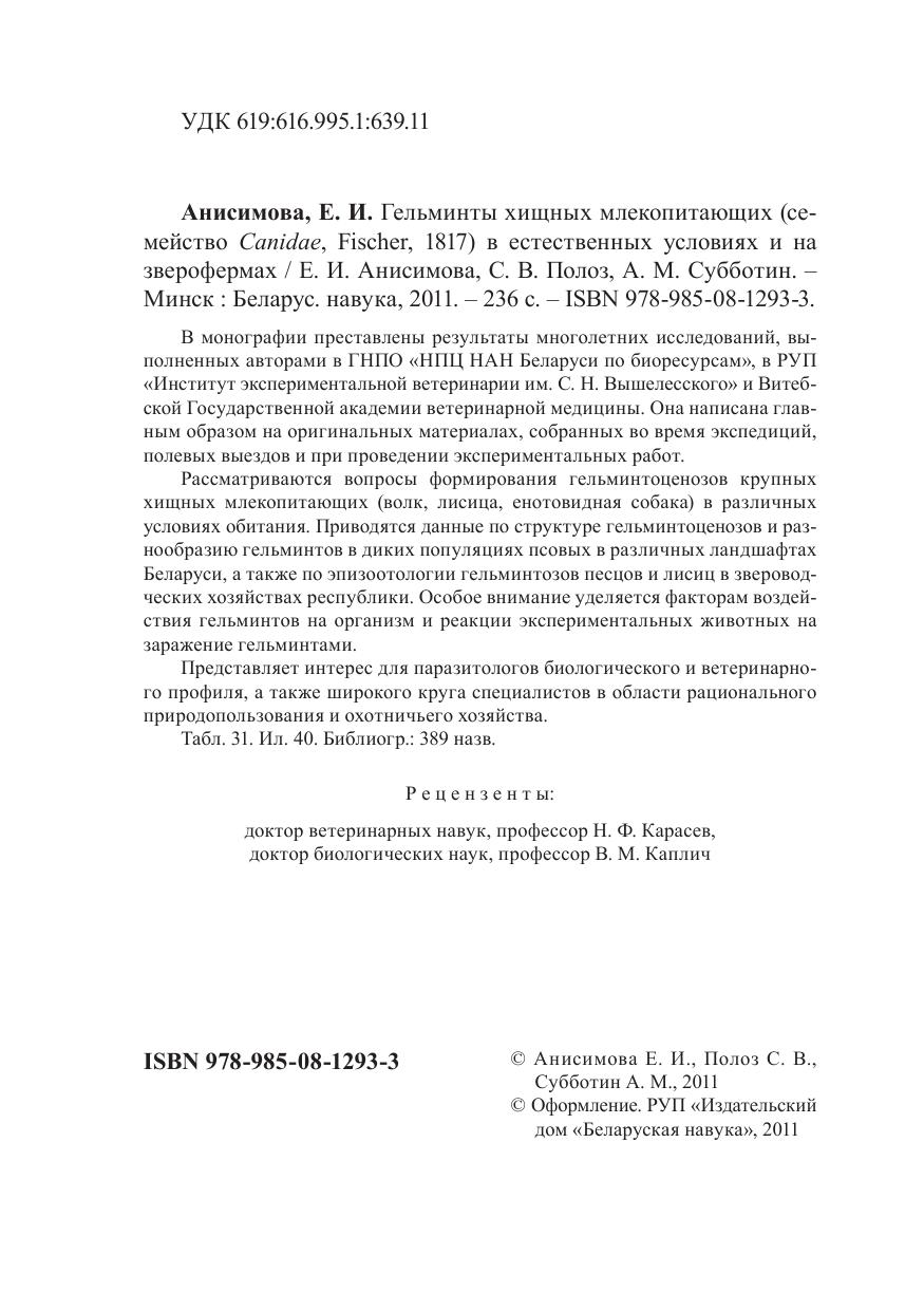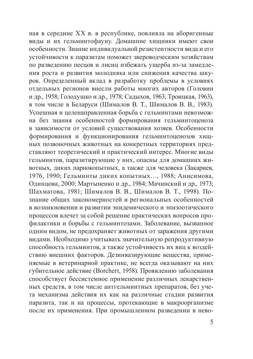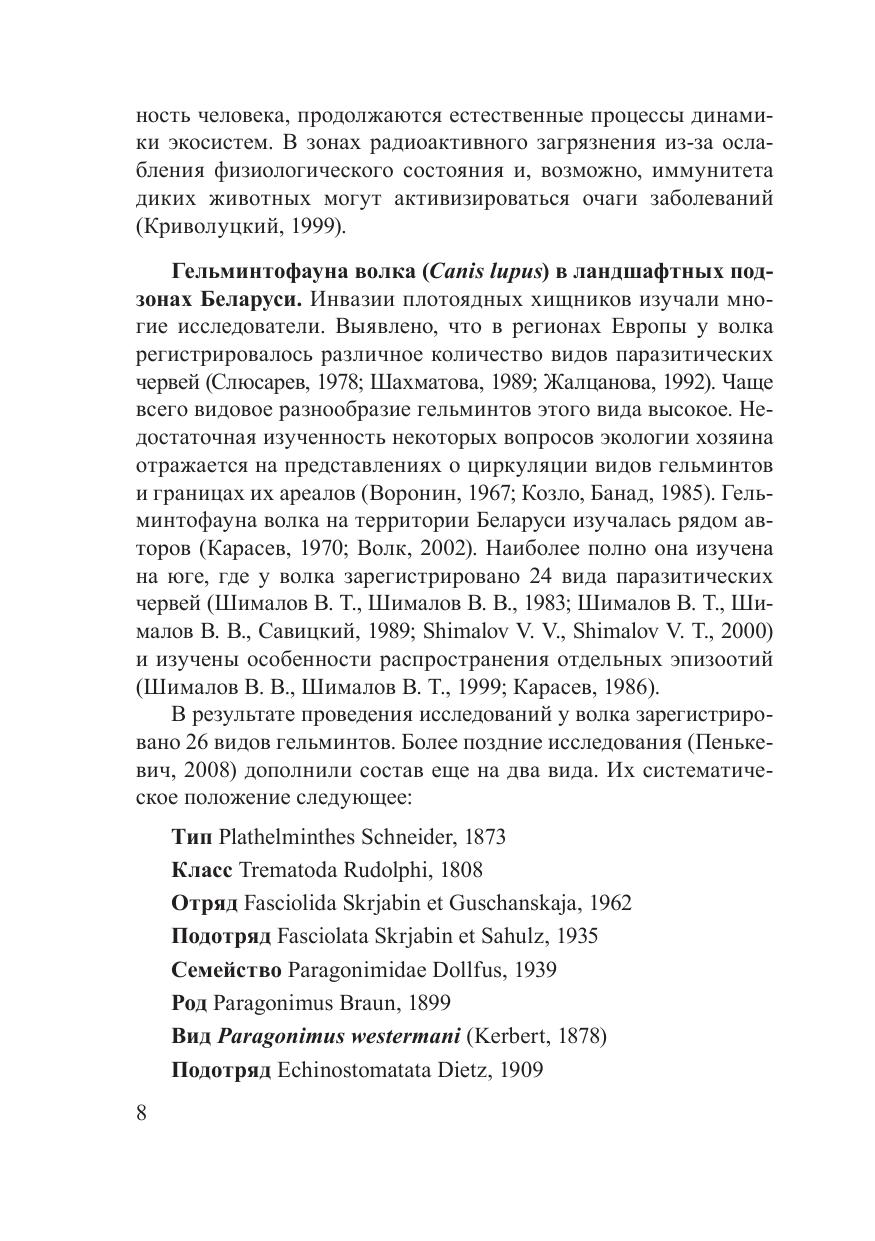 В монографии преставлены результаты многолетних исследований, выполненных авторами в ГНПО «НПЦ НАН Беларуси по биоресурсам», в РУП «Институт экспериментальной ветеринарии им. С. Н. Вышелесского» и Витебской Государственной академии ветеринарной медицины. Она написана главным образом на оригинальных материалах, собранных во время экспедиций, полевых выездов и при проведении экспериментальных работ. Рассматриваются вопросы формирования гельминтоценозов крупных хищных млекопитающих (волк, лисица, енотовидная собака) в различных условиях обитания. Приводятся данные по структуре гельминтоценозов и разнообразию гельминтов в диких популяциях псовых в различных ландшафтах Беларуси, а также по эпизоотологии гельминтозов песцов и лисиц в звероводческих хозяйствах республики. Особое внимание уделяется факторам воздействия гельминтов на организм и реакции экспериментальных животных на заражение гельминтами. Представляет интерес для паразитологов биологического и ветеринарного профиля, а также широкого круга специалистов в области рационального при одопользования и охотничьего хозяйства.