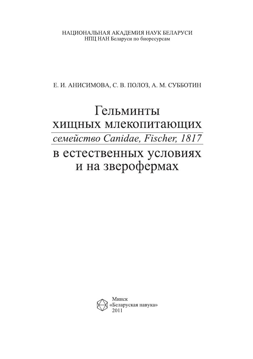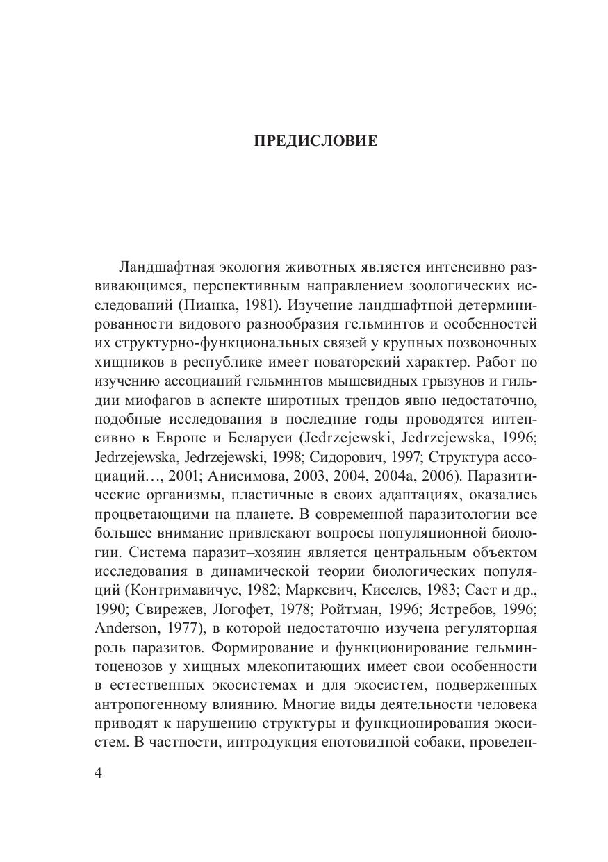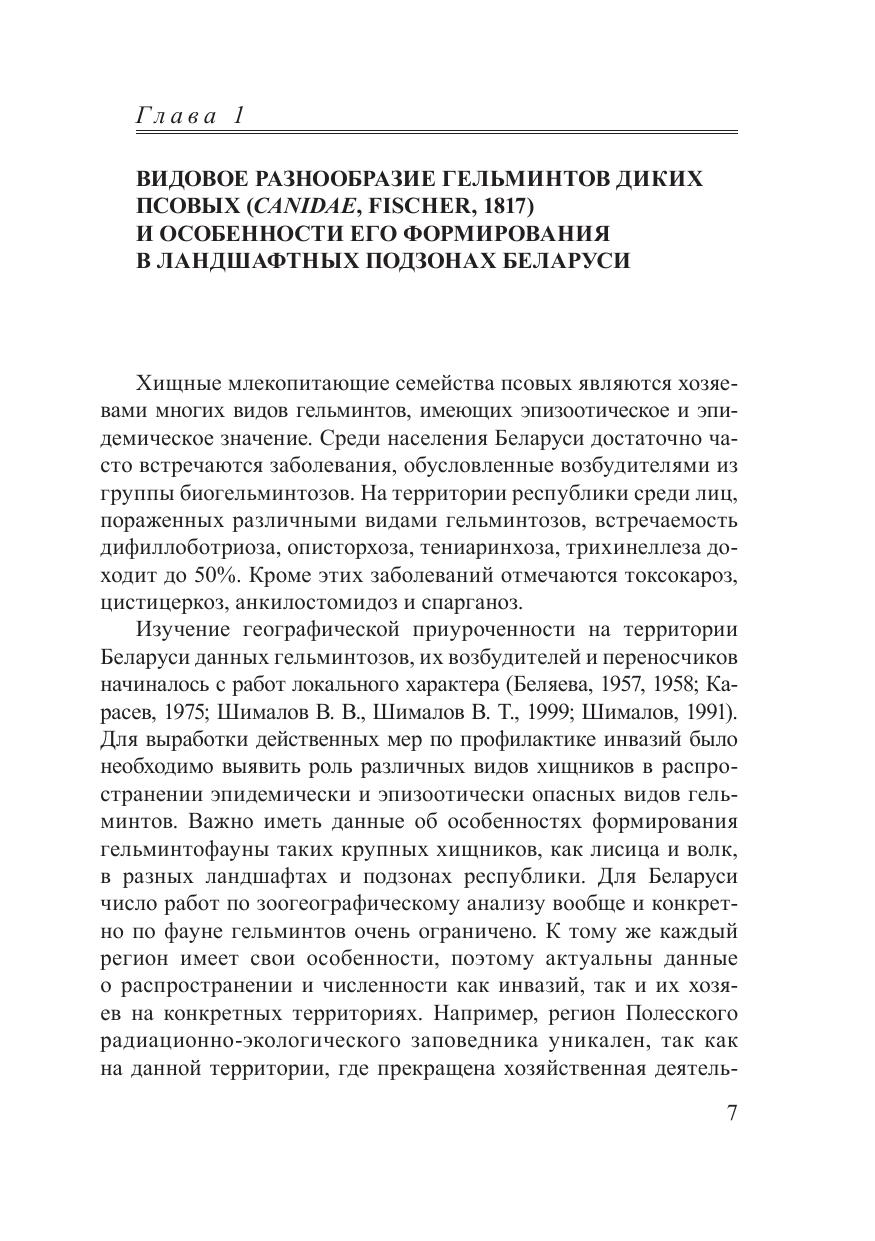 В монографии преставлены результаты многолетних исследований, выполненных авторами в ГНПО «НПЦ НАН Беларуси по биоресурсам», в РУП «Институт экспериментальной ветеринарии им. С. Н. Вышелесского» и Витебской Государственной академии ветеринарной медицины. Она написана главным образом на оригинальных материалах, собранных во время экспедиций, полевых выездов и при проведении экспериментальных работ. Рассматриваются вопросы формирования гельминтоценозов крупных хищных млекопитающих (волк, лисица, енотовидная собака) в различных условиях обитания. Приводятся данные по структуре гельминтоценозов и разнообразию гельминтов в диких популяциях псовых в различных ландшафтах Беларуси, а также по эпизоотологии гельминтозов песцов и лисиц в звероводческих хозяйствах республики. Особое внимание уделяется факторам воздействия гельминтов на организм и реакции экспериментальных животных на заражение гельминтами. Представляет интерес для паразитологов биологического и ветеринарного профиля, а также широкого круга специалистов в области рационального при одопользования и охотничьего хозяйства.