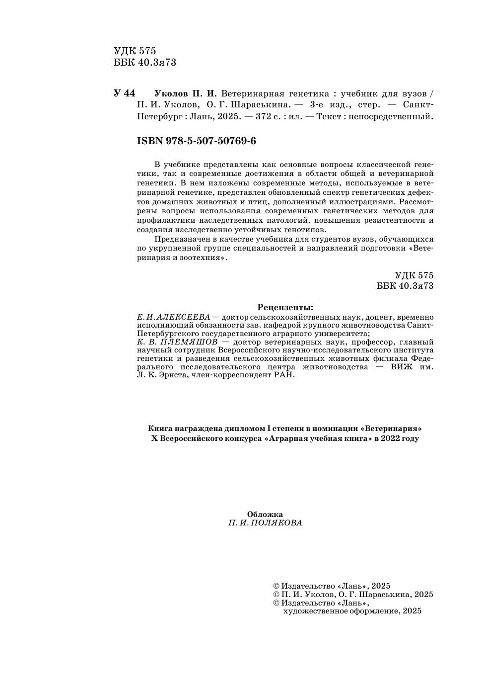 В учебнике представлены как основные вопросы классической генетики, так и современные достижения в области общей и ветеринарной генетики. В нем изложены современные методы, используемые в ветеринарной генетике, представлен обновленный спектр генетических дефектов домашних животных и птиц, дополненный иллюстрациями. Рассмотрены вопросы использования современных генетических методов для профилактики наследственных патологий, повышения резистентности и создания наследственно устойчивых генотипов. Предназначен в качестве учебника для студентов вузов, обучающихся по укрупненной группе специальностей и направлений подготовки «Ветеринария и зоотехния».