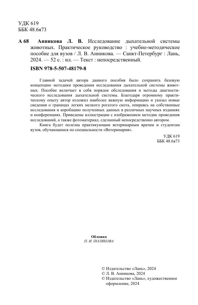 Главной задачей автора данного пособия было сохранить базовую концепцию методики проведения исследования дыхательной системы животных. Пособие включает в себя порядок обследования и методы диагностического исследования дыхательной системы. Благодаря огромному практическому опыту автор изложил наиболее важную информацию и указал новые сведения о границах легких мелкого рогатого скота, опираясь на собственные исследования и апробацию полученных данных в различных научных изданиях и конференциях. Приведены иллюстрации с изображением методик проведения исследований, а также фотоматериал, сделанный непосредственно автором. Книга будет полезна практикующим ветеринарным врачам и студентам вузов, обучающимся по специальности «Ветеринария».