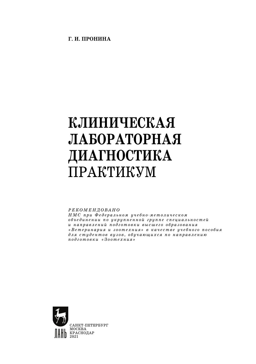 Издание предназначено для студентов очного отделения факультета зоотехнии и биологии и разработано в соответствии с рабочей программой «Клиническая лабораторная диагностика» и учебным планом студентов, обучающихся по специальности «Ветеринария» и по направлению подготовки «Зоотехния» (магистерская программа «Физиолого-биохимический мониторинг здоровья и питания животных»).