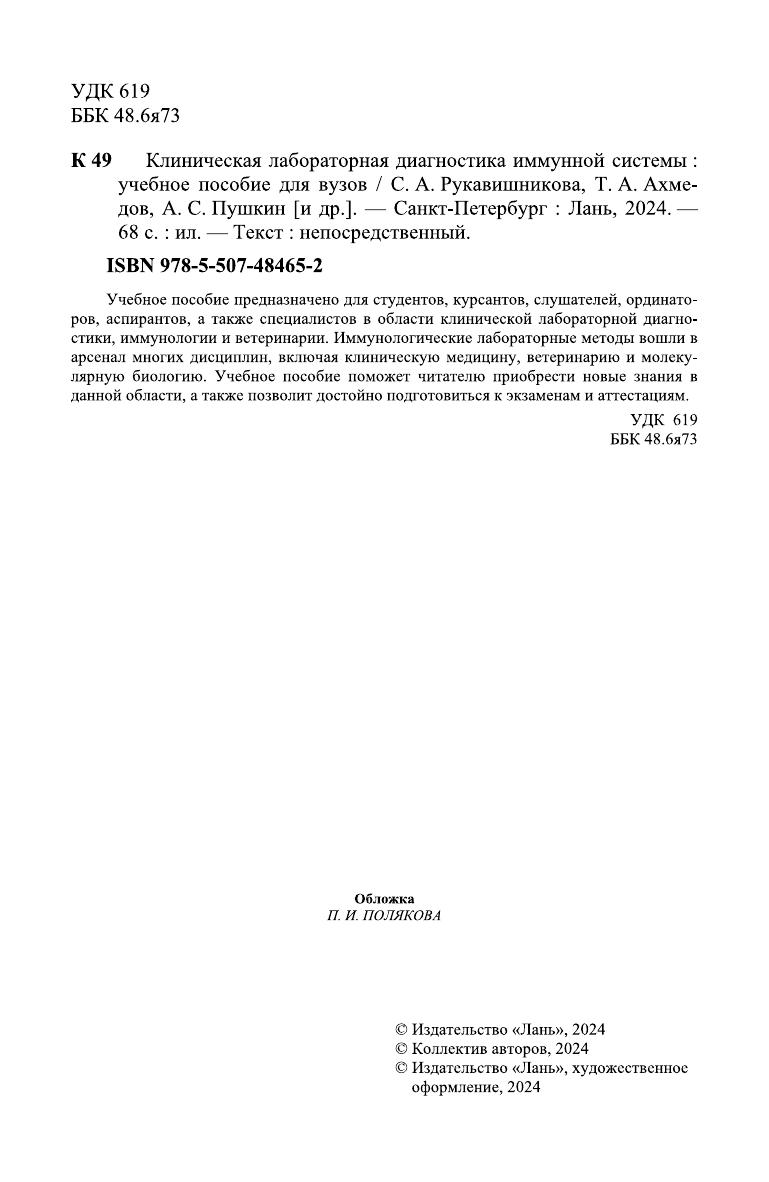 Учебное пособие предназначено для студентов, курсантов, слушателей, ординаторов, аспирантов, а также специалистов в области клинической лабораторной диагностики, иммунологии и ветеринарии. Иммунологические лабораторные методы вошли в арсенал многих дисциплин, включая клиническую медицину, ветеринарию и молекулярную биологию. Учебное пособие поможет читателю приобрести новые знания в данной области, а также позволит достойно подготовиться к экзаменам и аттестациям.