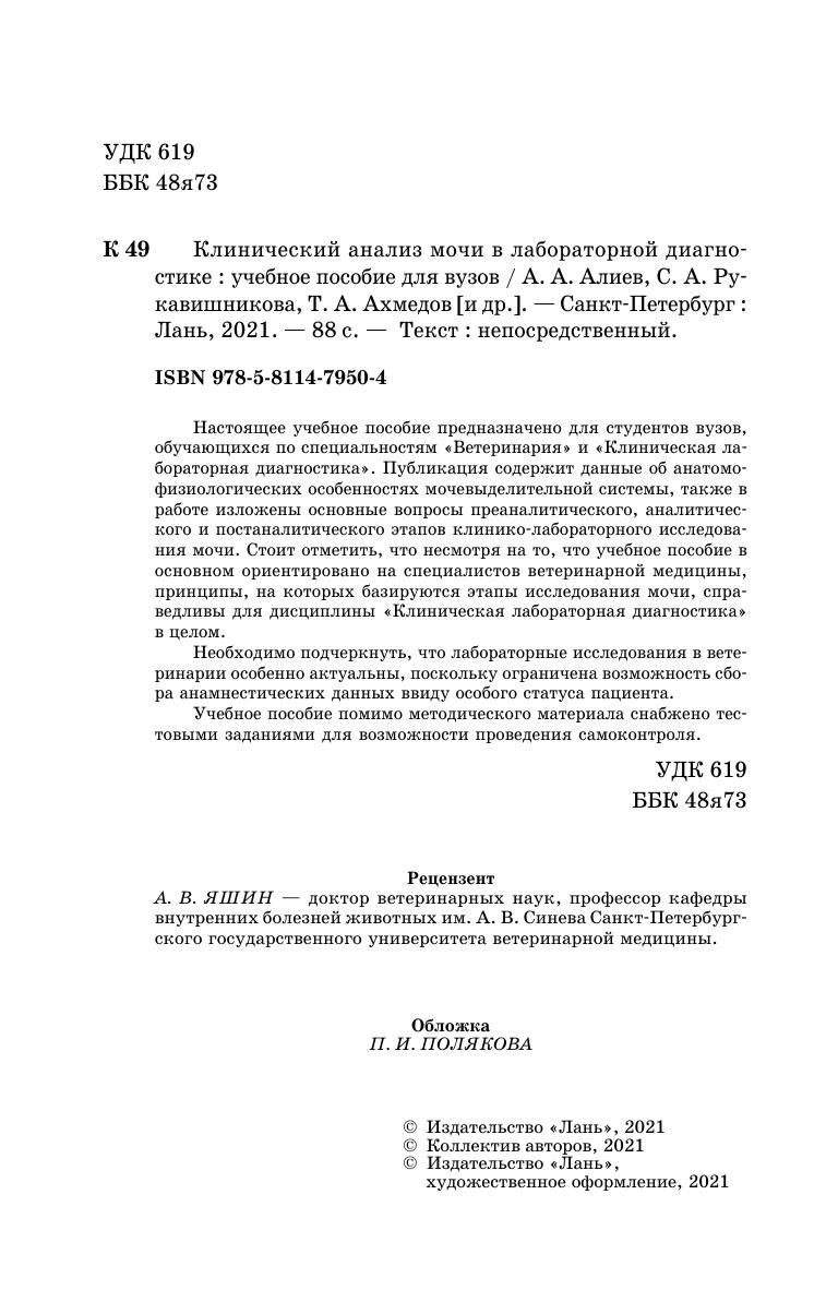 Настоящее учебное пособие предназначено для студентов, обучающихся по специальностям «Ветеринария» и «Клиническая лабораторная диагностика». Публикация содержит данные об анатомо-физиологических особенностях мочевыделительной системы, также в работе изложены основные вопросы преаналитического, аналитического и постаналитического этапов клинико-лабораторного исследования мочи. Стоит отметить, что несмотря на то, что учебное пособие в основном ориентировано на специалистов ветеринарной медицины, принципы, на которых базируются этапы исследования мочи, справедливы для дисциплины «Клиническая лабораторная диагностика» в целом.