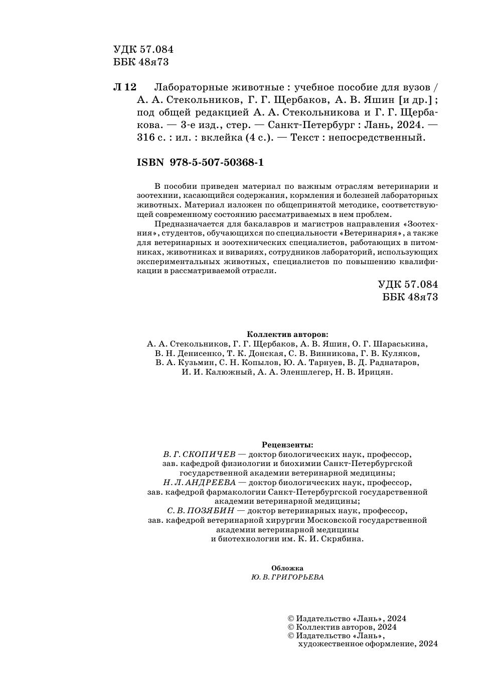 В пособии приведен материал по важным отраслям ветеринарии и зоотехнии, касающийся содержания, кормления и болезней лабораторных животных. Изложен по общепринятой методике, соответствующей современному состоянию рассматриваемых в нем проблем. Предназначается для бакалавров и магистров направления Зоотехния, студентов, обучающихся по специальности Ветеринария, а также для ветеринарных и зоотехнических специалистов, работающих в питомниках, животниках и вивариях, сотрудников лабораторий, использующих экспериментальных животных, специалистов по повышению квалификации в рассматриваемой отрасли.