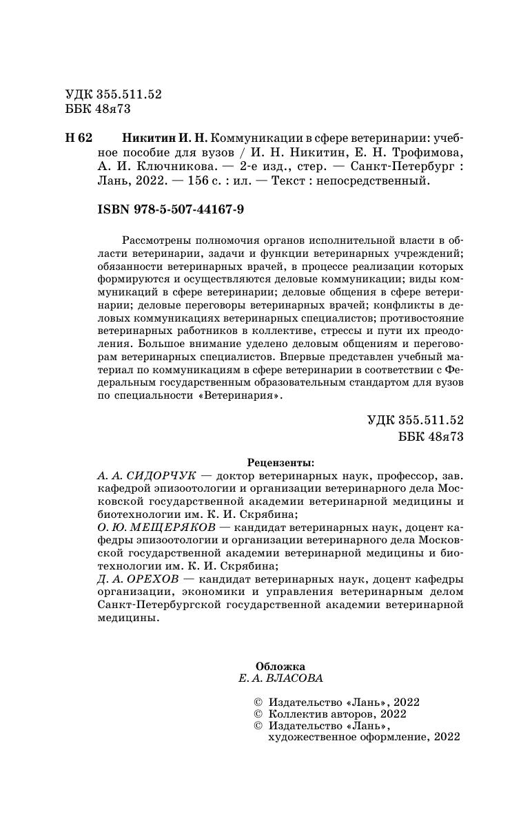 Рассмотрены полномочия органов исполнительной власти в области ветеринарии, задачи и функции ветеринарных учреждений; обязанности ветеринарных врачей, в процессе реализации которых формируются и осуществляются деловые коммуникации; виды коммуникаций в сфере ветеринарии; деловые общения в сфере ветеринарии; деловые переговоры ветеринарных врачей; конфликты в деловых коммуникациях ветеринарных специалистов; противостояние ветеринарных работников в коллективе, стрессы и пути их преодоления. Большое внимание уделено деловым общениям и переговорам ветеринарных специалистов. Впервые представлен учебный материал по коммуникациям в сфере ветеринарии в соответствии с Федеральным государственным образовательным стандартом по специальности «Ветеринария».
