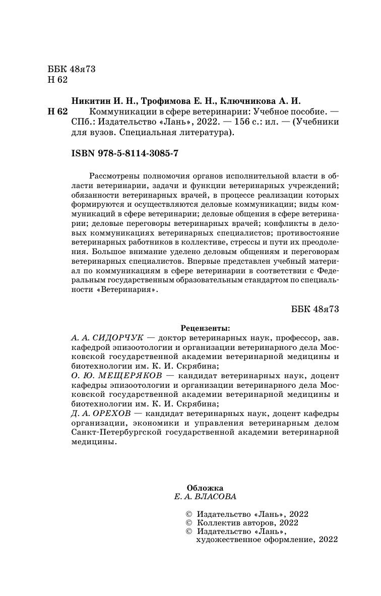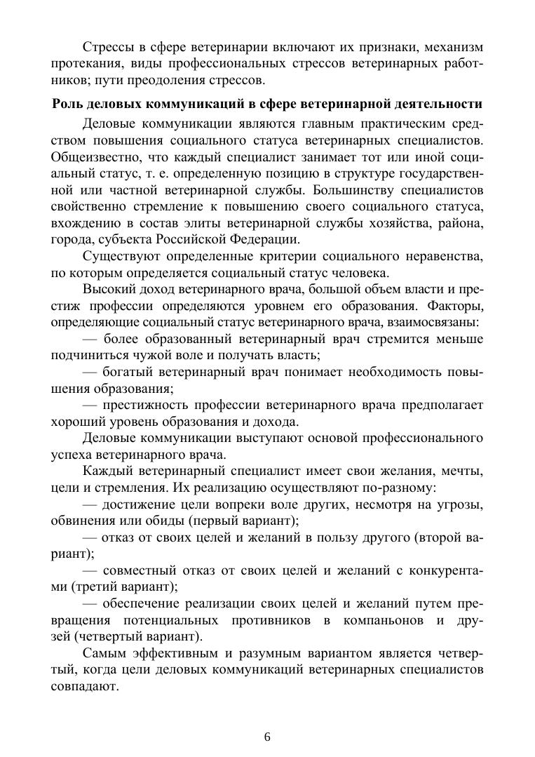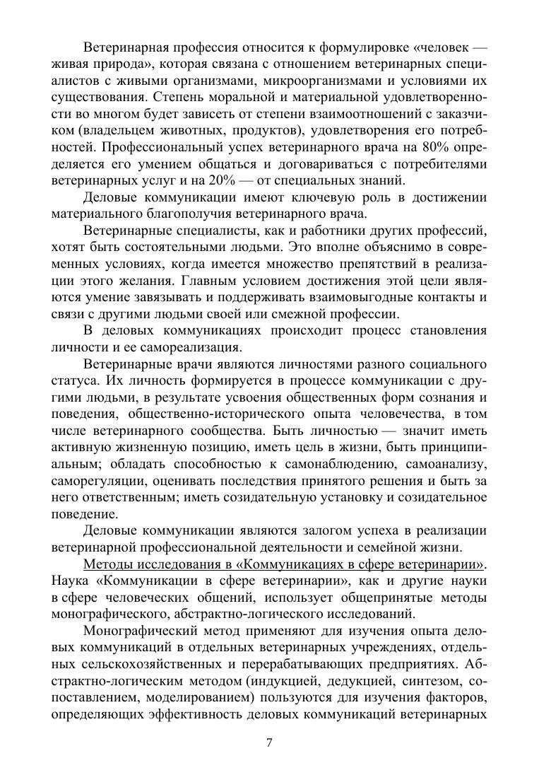 Рассмотрены полномочия органов исполнительной власти в области ветеринарии, задачи и функции ветеринарных учреждений, обязанности ветеринарных врачей, в процессе реализации которых формируются и осуществляются деловые коммуникации, виды коммуникаций в сфере ветеринарии, деловые общения в сфере ветеринарии, деловые переговоры ветеринарных врачей, конфликты в деловых коммуникациях ветеринарных специалистов, противостояние ветеринарных работников в коллективе, стрессы и пути их преодоления. Большое внимание уделено деловым общениям и переговорам ветеринарных специалистов. Впервые представлен учебный материал по коммуникациям в сфере ветеринарии в соответствии с Федеральным государственным образовательным стандартом по специальности «Ветеринария».