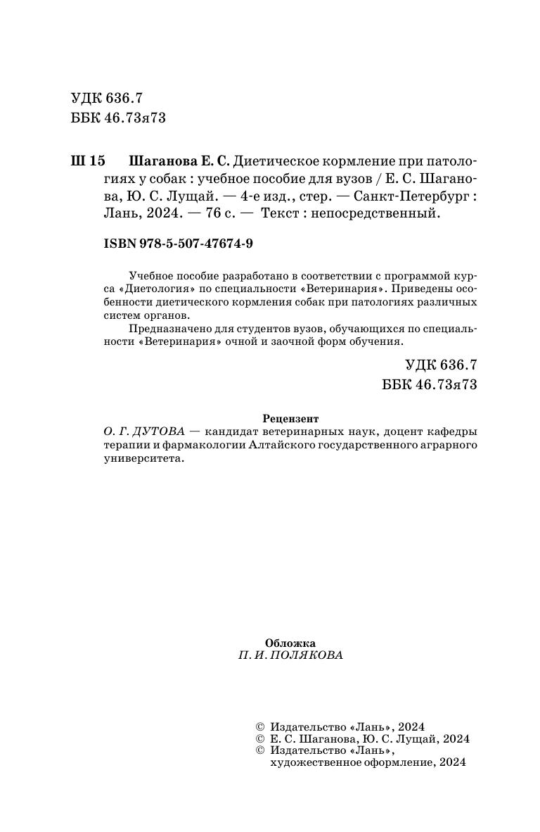 Учебное пособие разработано в соответствии с программой курса Диетология по специальности "Ветеринария". Приведены особенности диетического кормления собак при патологиях различных систем органов. Предназначено для студентов вузов, обучающихся по специальности "Ветеринария" очной и заочной форм обучения.