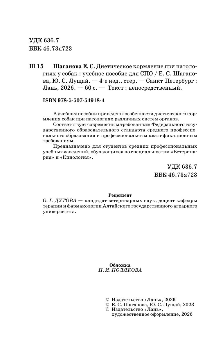 В учебном пособии приведены особенности диетического кормления собак при патологиях различных систем органов. Соответствует современным требованиям Федерального государственного образовательного стандарта среднего профессионального образования и профессиональным квалификационным требованиям. Предназначено для студентов средних профессиональных учебных заведений ветеринарной и кинологической направленности.